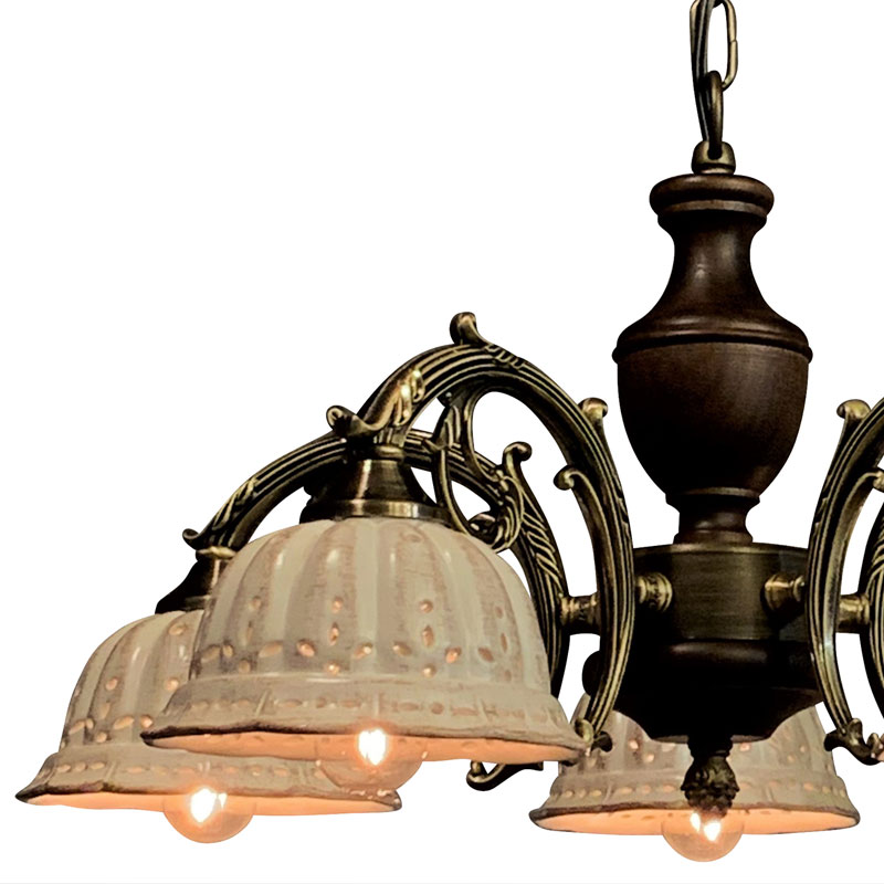 鋳物アームにイタリア製の陶器シェードを合わせました5灯シャンデリア照明