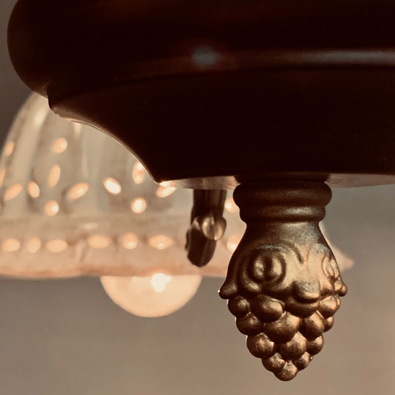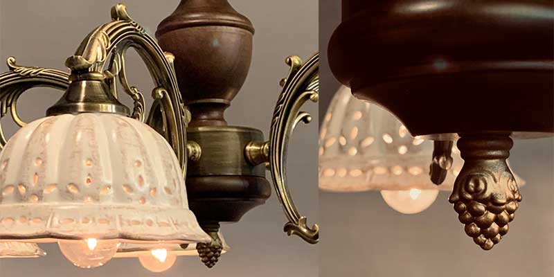 陶器シェード表面にはエイジング塗装を施してあり、落ち着いた雰囲気のシャンデリアです。