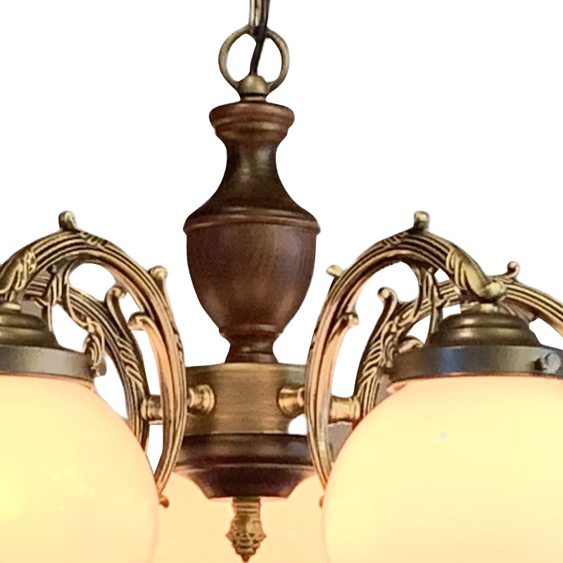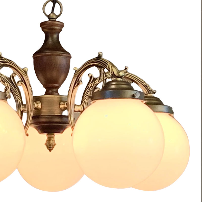 鋳物アームにレトロな雰囲気の丸ガラスを合わせた5灯シャンデリア照明