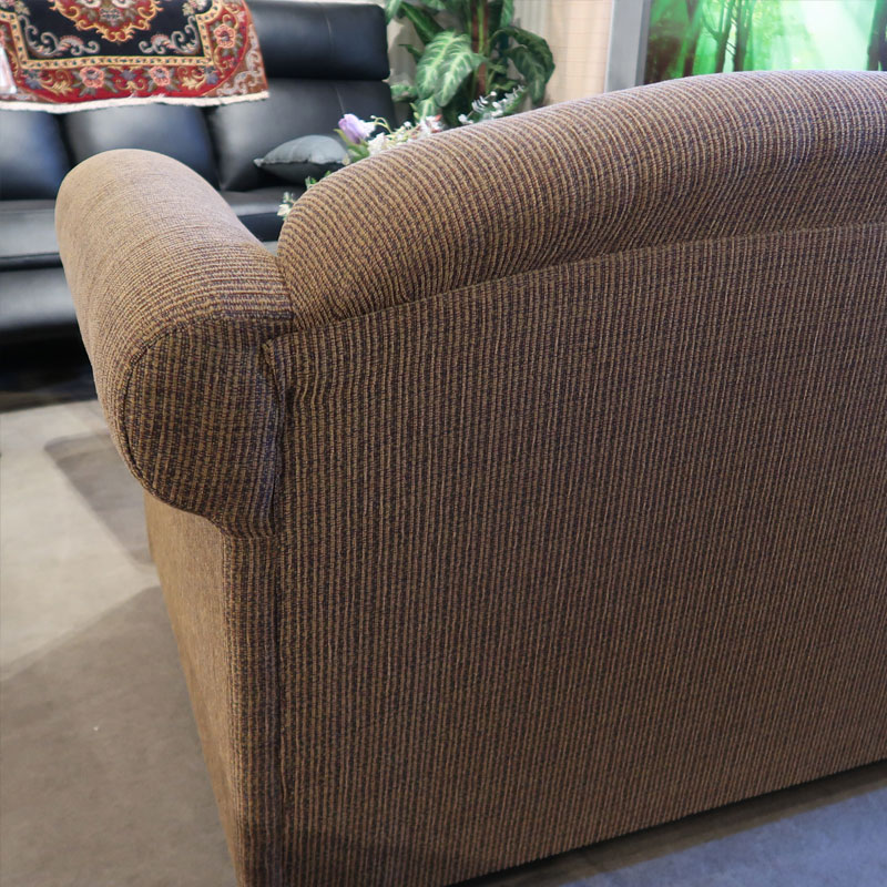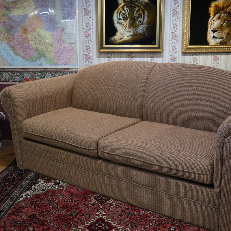 カナダ製の直輸入ソファーです。シートクッションは、硬質ウレタンを使用し、シートクッション下のデッキ部分はスプリング構造になっています。茶色の単色のファブリックを、シンプルなトラディショナルデザインのソファーに張りました。お部屋を選ばず、コーディネートのしやすさも魅力の三人掛けソファーです。