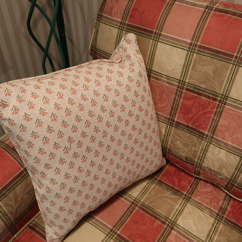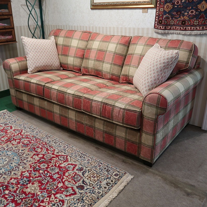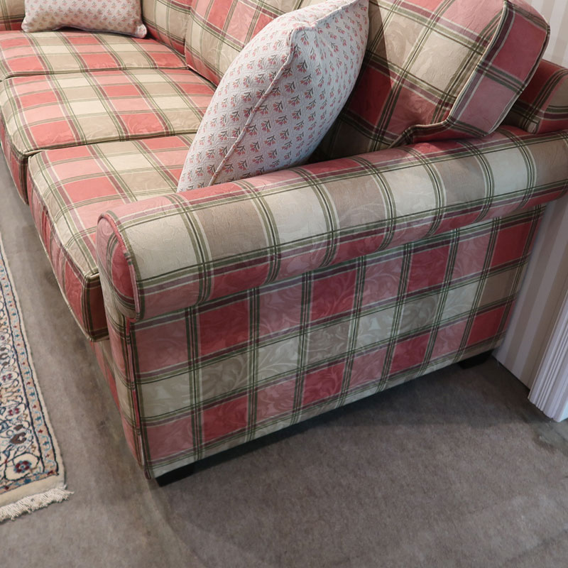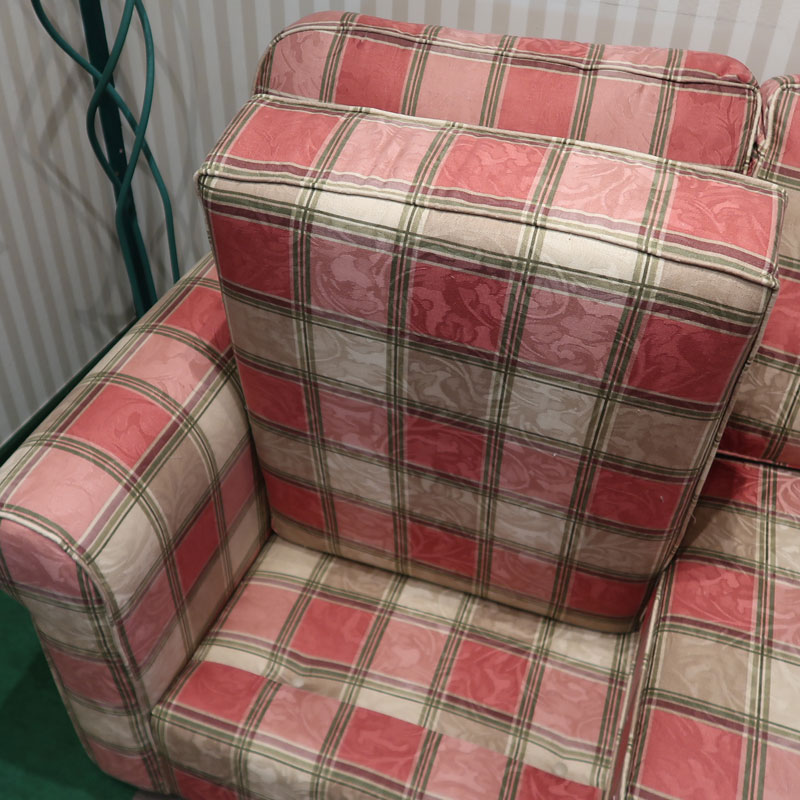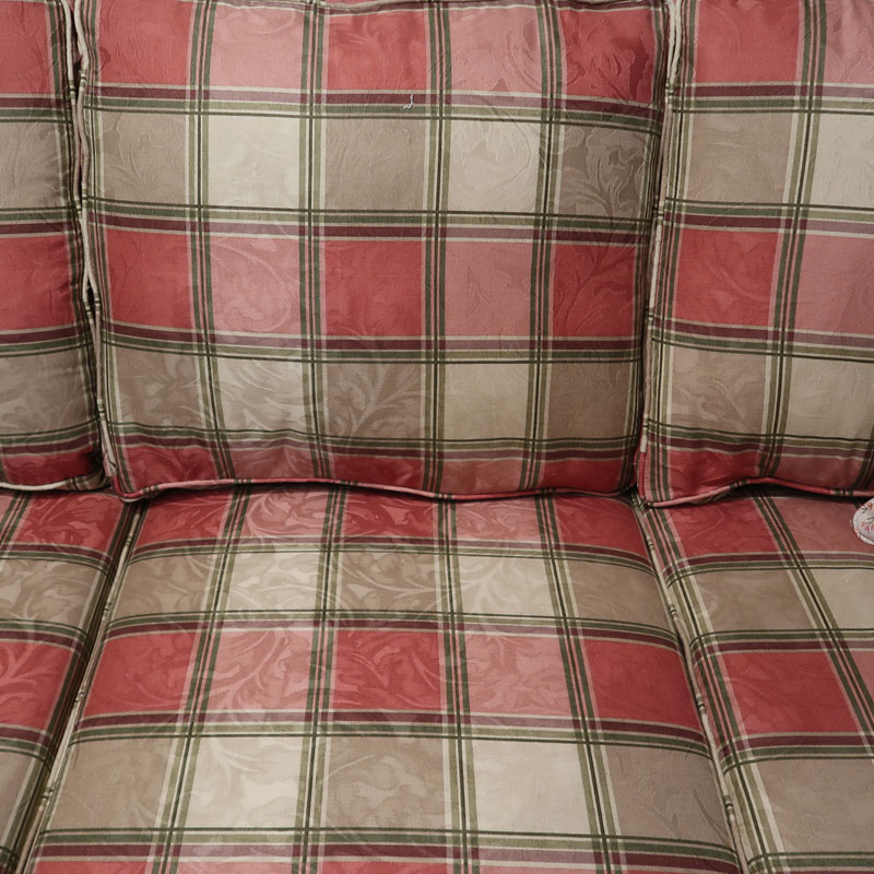 カナダ製の直輸入ソファーです。シートクッションは、ハイグレードウレタンを使用し、シートクッション下のデッキ部分はコイルスプリング構造になっています。トラディショナルなチェック柄に植物の織り柄の入ったとてもおしゃれなファブリックを使用しております。お部屋を華やかにしてくれるの三人掛けのソファーです。