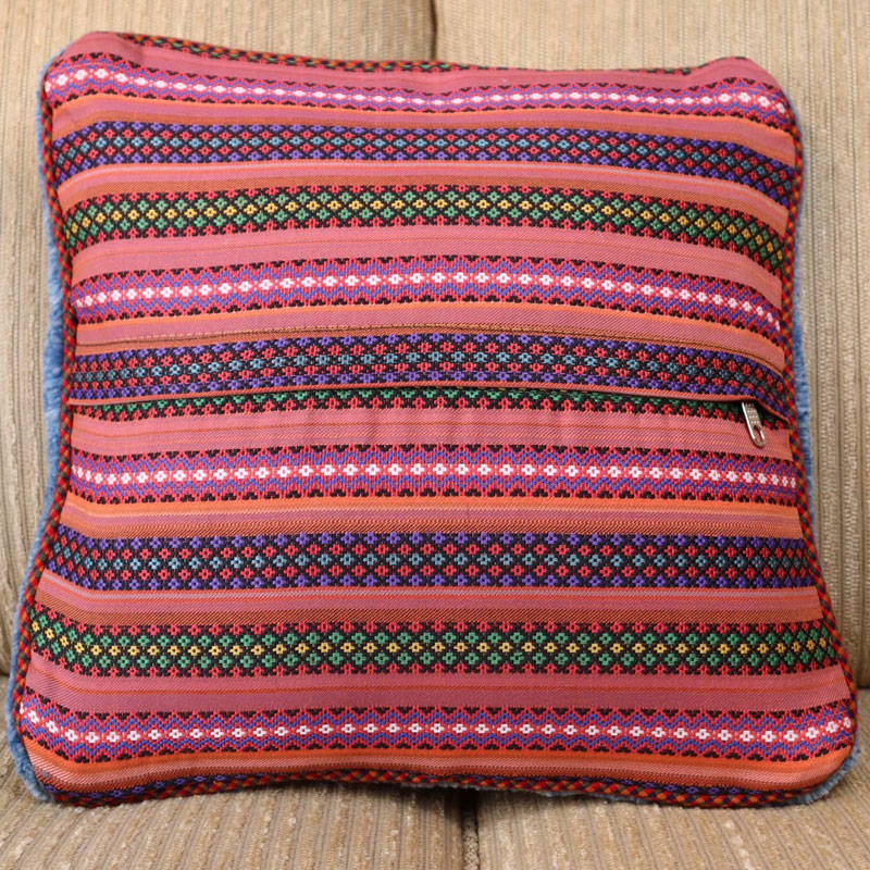 ブルーベースに赤色のボーダーの枠入れ、枠の中には、不自由のない生活を送ることへの願いを込めた羊がデザインされたギャベクッション。