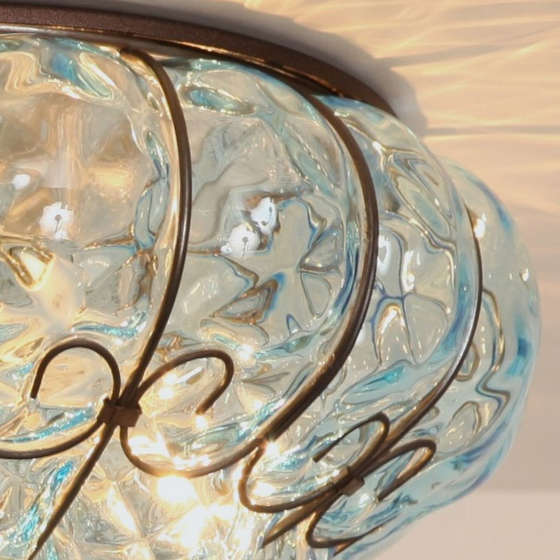イタリアムラノ島(ヴェネチア)の工房にて、一つ一つ職人の手によって作られている、ちょっと大き目なムラノガラスアンバー3灯シーリング照明。スチールの枠にガラスを吹き込む伝統的なこの工法は、ガラスに立体感が生まれとても存在感のあるガラス製品となります。