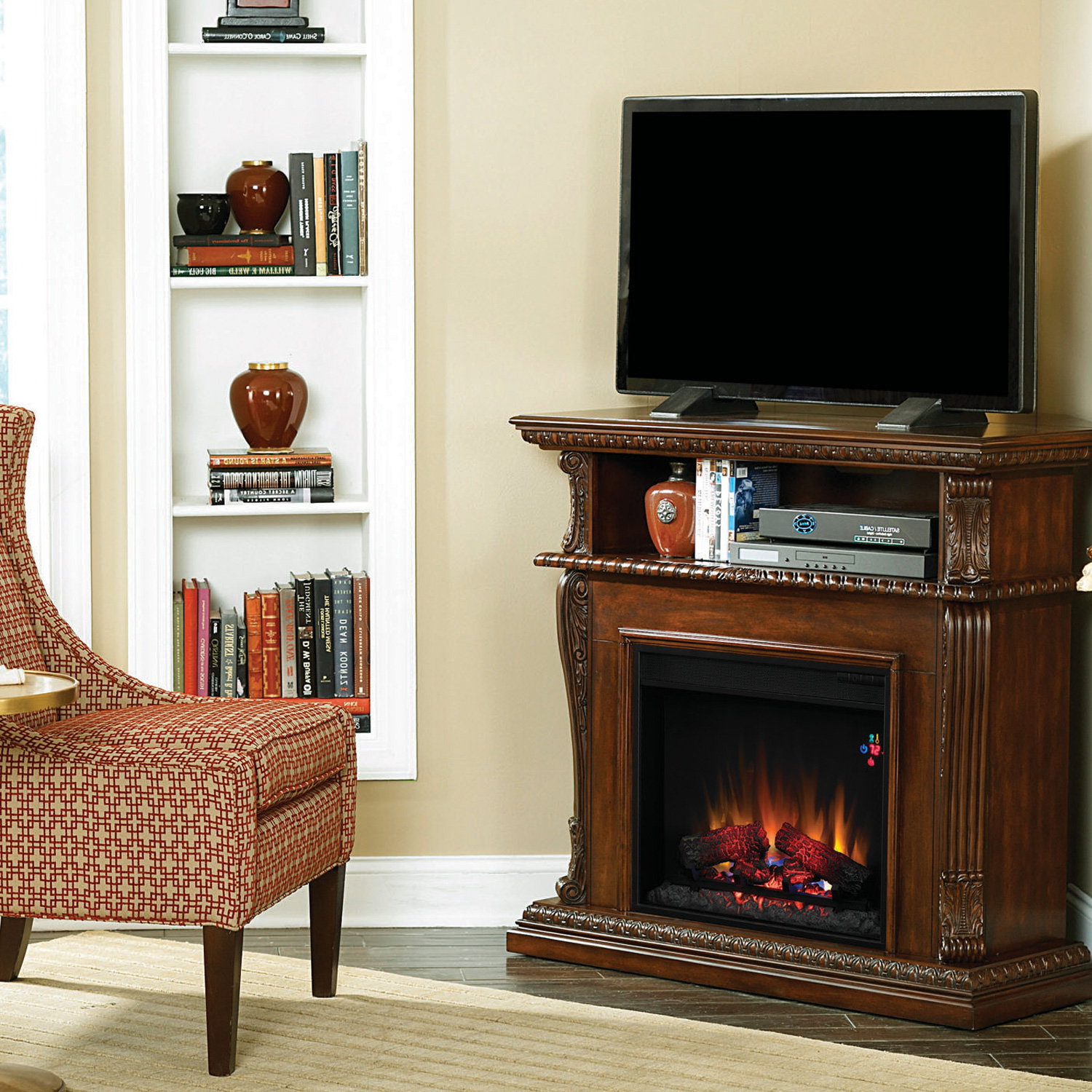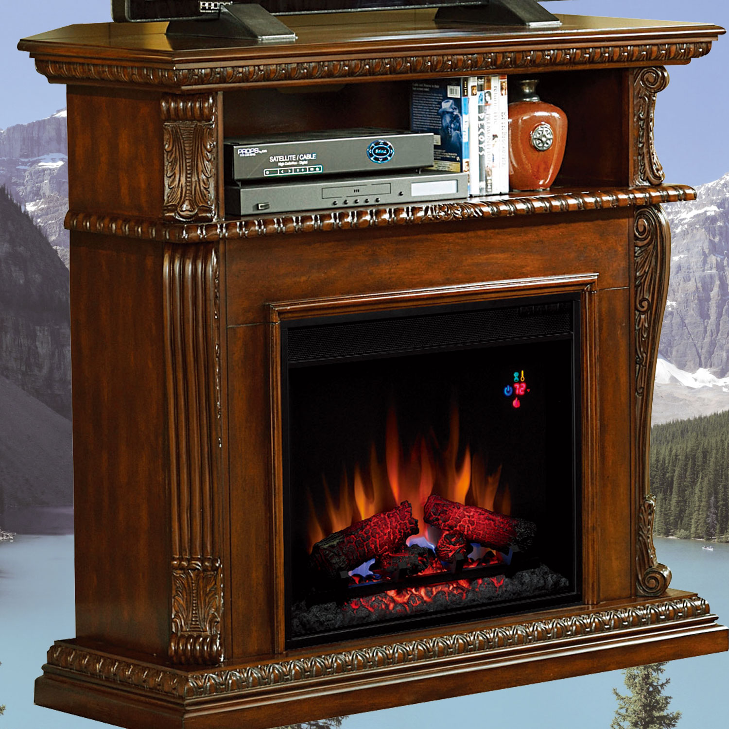 暖炉の本体上部にオープンスペースを配し、DVD機器などを置き、テレビボードとしても使用可能な革新的で機能的な電気暖炉炉コリンス1000W。暖炉棚には、ヨーロッパの伝統的な彫刻を施し、より格調的なデザイン。