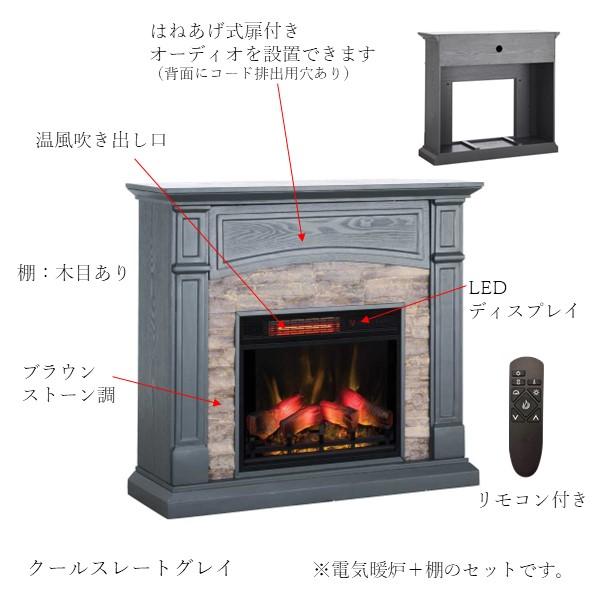 天板の下にオーディオ機器が収納可能な、人気のコンパクトタイプの電気式暖炉。
