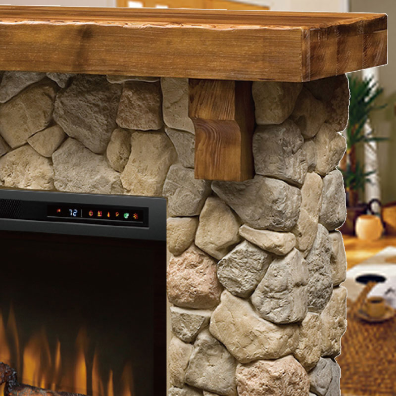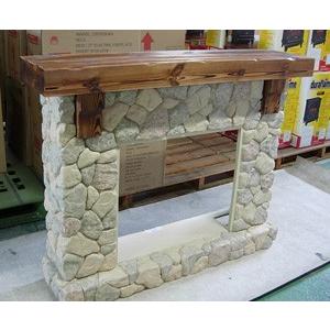 本物の石を積み上げたような風格を持ち、天板には、分厚い木材をあしらい重厚感のあるマントルピース。