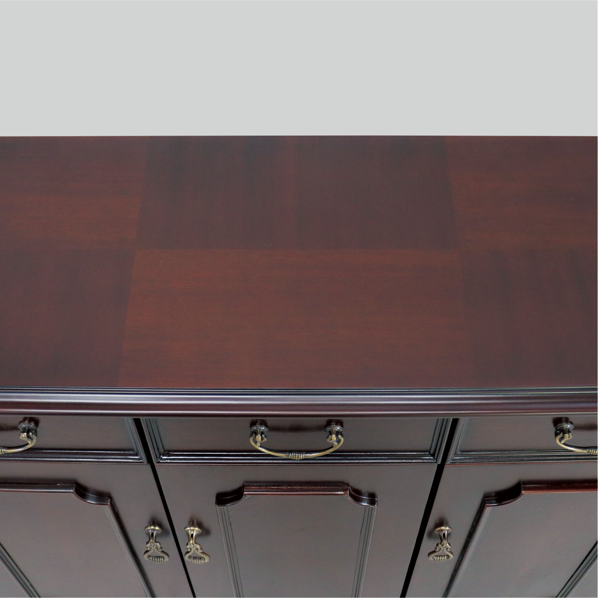 ソファー・ダイニングチェアの脚やキャビネットの扉の表面などには彫刻で仕上げたリブ(浮き上がる彫刻)が施されています。あくまでもシンプルに、大げさにならないようにしたこの木製の模様はさりげないデザインポイントとなっています。また、天板の中心を囲むように施された突き板の化粧張りが優美さを表現しています。また、ガラスキャビネットに使われている木格子はチッペンデール様式の頃の中国建築に影響を受けた形が取り入れられています。