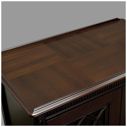 ソファー・ダイニングチェアの脚やキャビネットの扉の表面などには彫刻で仕上げたリブ(浮き上がる彫刻)が施されています。あくまでもシンプルに、大げさにならないようにしたこの木製の模様はさりげないデザインポイントとなっています。また、天板の中心を囲むように施された突き板の化粧張りが優美さを表現しています。また、ガラスキャビネットに使われている木格子はチッペンデール様式の頃の中国建築に影響を受けた形が取り入れられています。