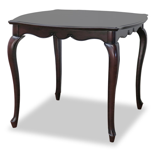 (沖縄、離島等一部地域を除く) 四辺弧を描いた天板の表面にマホガニー材突板の逆ダイアモンド貼りを施し、落着きあるダーク色に仕上げた幅85cmのコンパクトなテーブルと、優しく背をサポートする曲線フレームと、フトタッチのベージュのファブリックが映えるチェア-Dの、エレガントな3点セットです。