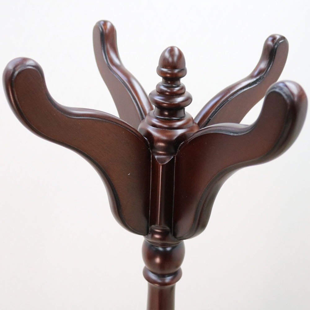 〔中間フックの高さ〕1025mm 〔ノックダウン〕2分割 〔上部ハンガー部〕耐荷重;5㎏(4本合計) 〔中間フック部〕耐荷重:5㎏(4本合計) ※耐荷重は目安の数値で保証値ではございません。予めご了承ください。 ※写真と商品は色合いが多少異なる場合がございます。予めご了承ください。フルールDM マホガニー材を贅沢に使ったポールハンガー 逆輸入家具