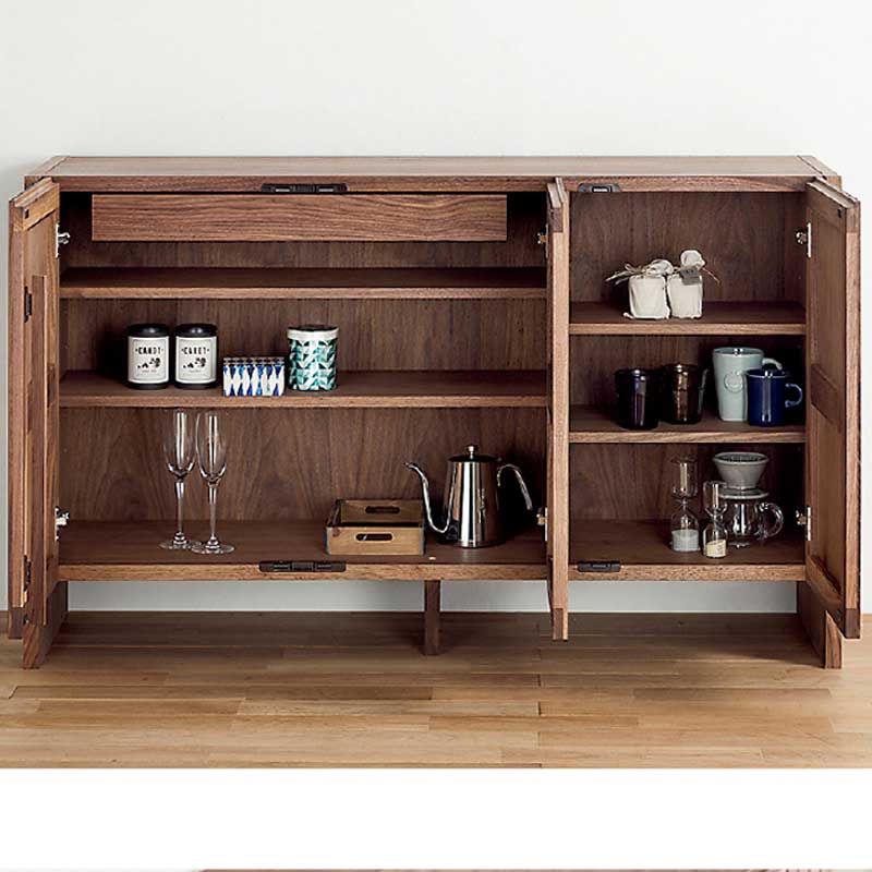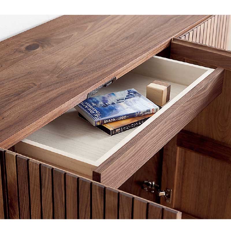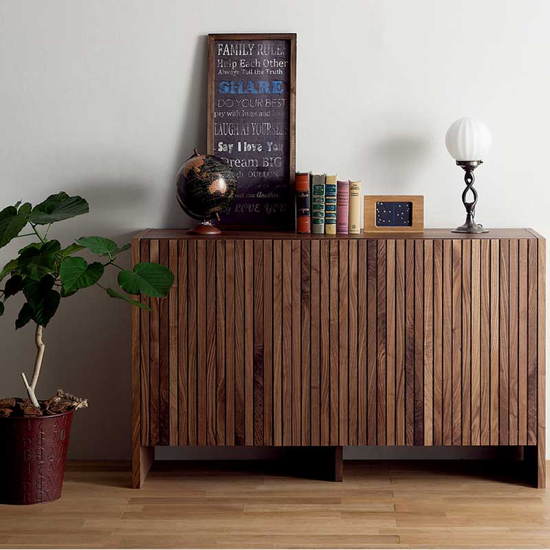 ウォールナット無垢材をふんだんに使い製作された1315mm幅のサイドボードです。前面のデザインは、ウォールナット無垢材の縦格子で、和、洋どちらのデザインでも合わせやすいサイドボードです。