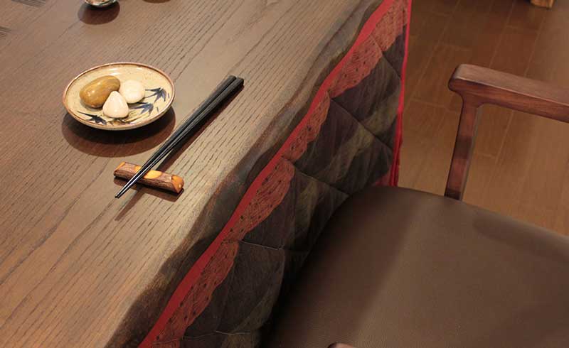 天板中央には、彫り加工、天板縁にはなぐり加工を施したダイニングこたつ和華。