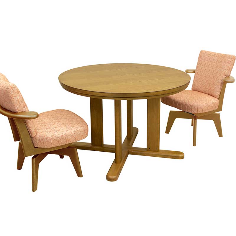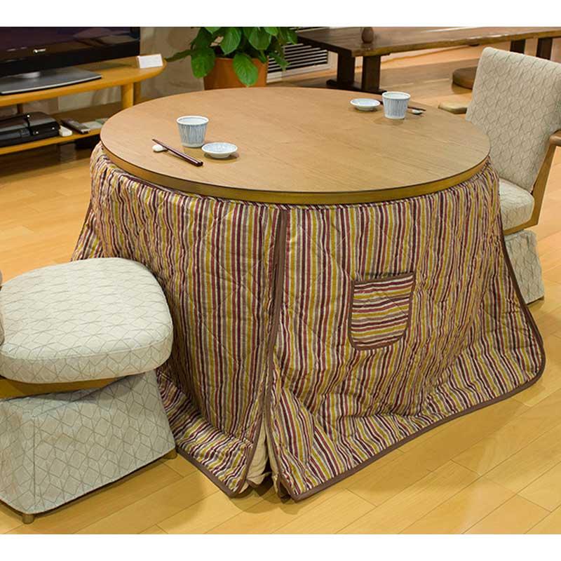 木目の美しいタモ材を使用した丸暖卓。フローリングにも合わせやすいデザインのダイニングこたつ輪島KR。