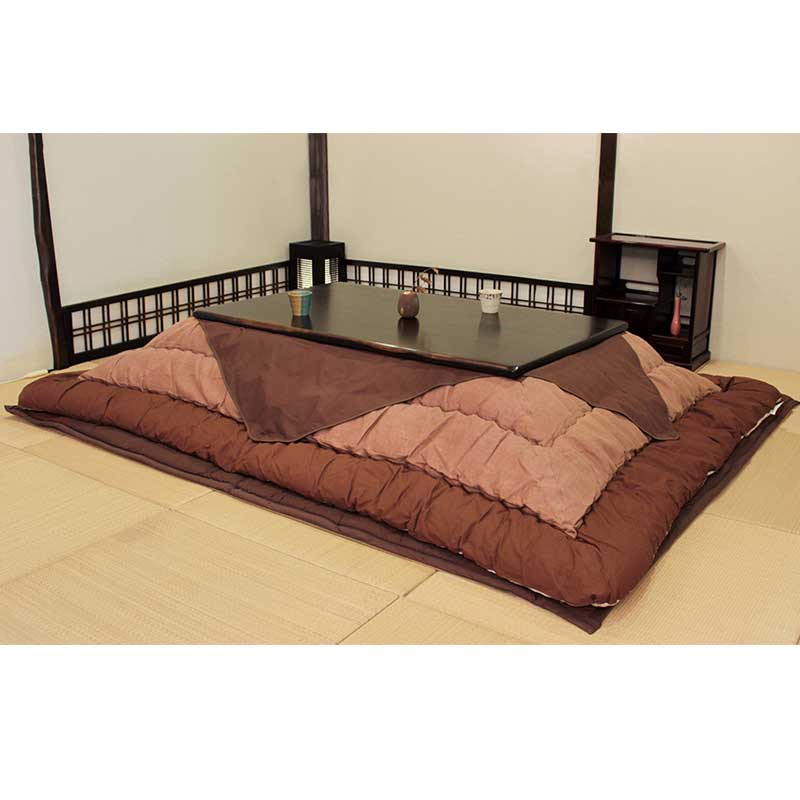 長方形135cm~150cm幅用柿渋染めの国産サロン付こたつふとんセット(掛けふとん+敷ふとん+サロン)。