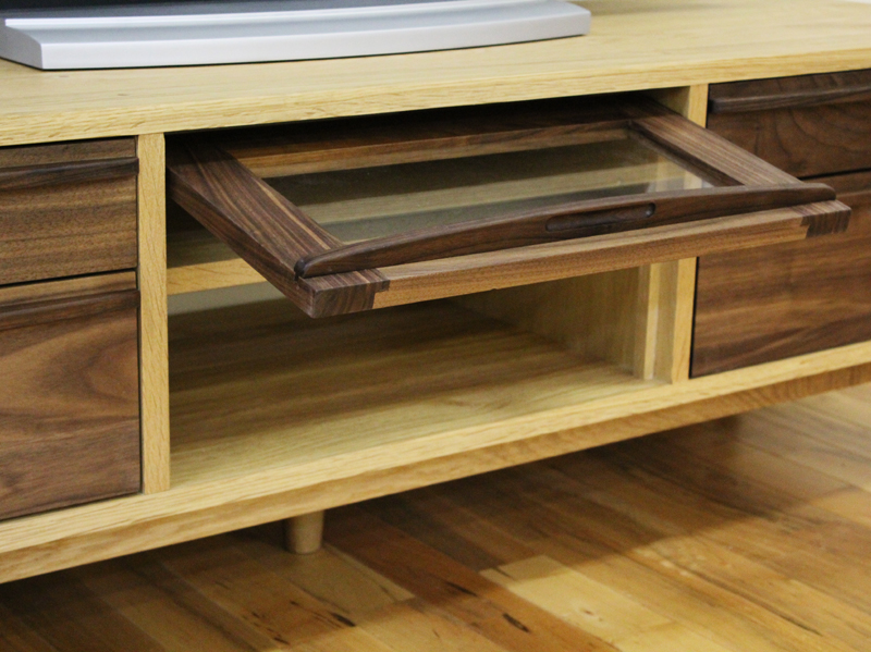 国内デザイナーがデザインした前板にウォールナット無垢材、本体にオーク無垢材を使ったコンビネーションがとても素敵な150cm幅テレビボードです。機能性も充実した逸品です。