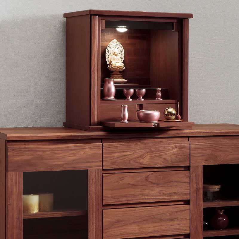 ウォールナット材で造られた扉が側面に収納されるミニ仏壇です。