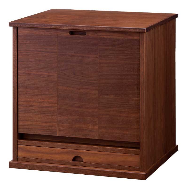 ウォールナット材で製作された扉が、押し込み式で膳引きにもなるミニ仏壇です。