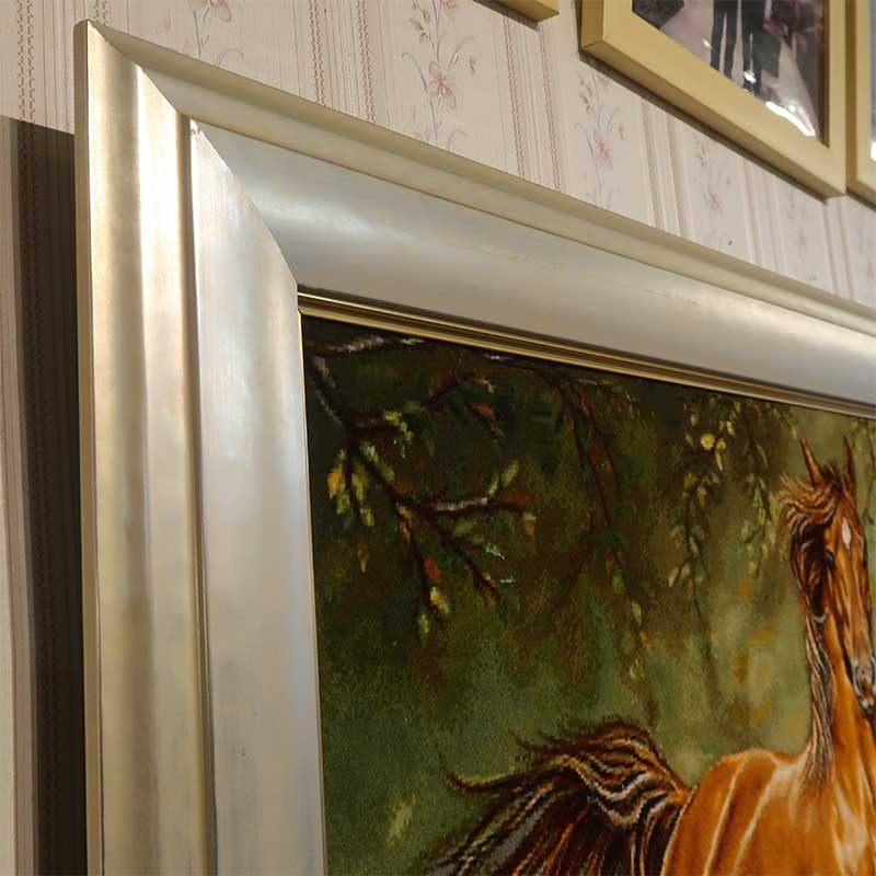 こちらの絨毯絵画は、絨毯は、イランの工房から直接仕入れ、額は、絨毯にあわせ国内で製作いたしました。額の製作は、国内有数の油絵額専門の工房です。