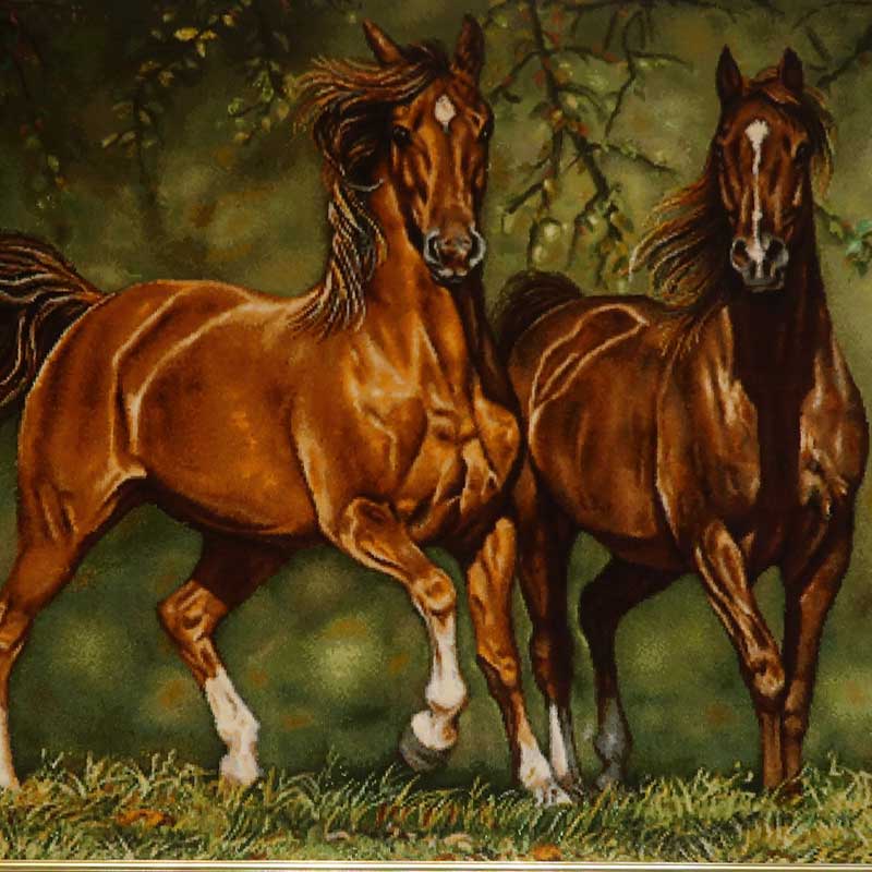 絨毯デザイナーそして絨毯工房も数件持つバヤットさんとイランのバザールを歩き回り、絨毯絵画を専門に扱う工房やお店を案内していただき、その時、馬の毛並みに目がひきつけられて仕入れました。
