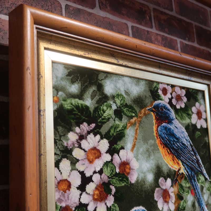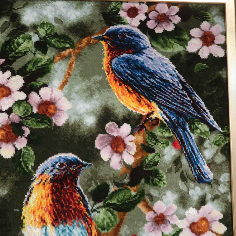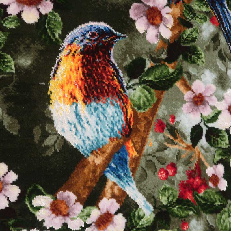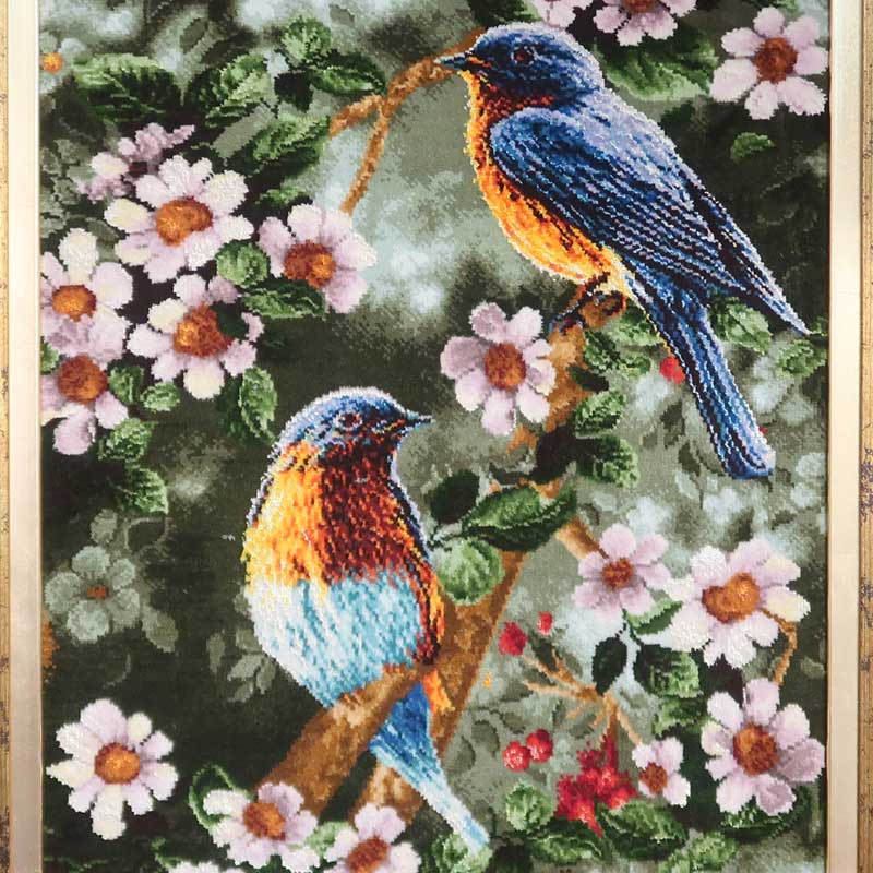 ペルシャ絨毯タブリーズ産のピクチャ(絵)絵画です。ウールとシルクで緻密に織られた手織りの絨毯の絵は、近くで見なければ油絵のようです。こちらの絵はのタイトルはさえずりです。絨毯デザイナーそして絨毯工房も数件持つバヤットさんとイランのバザールを歩き回り、絨毯絵画を専門に扱う工房やお店を案内していただき、その時、探した一枚。