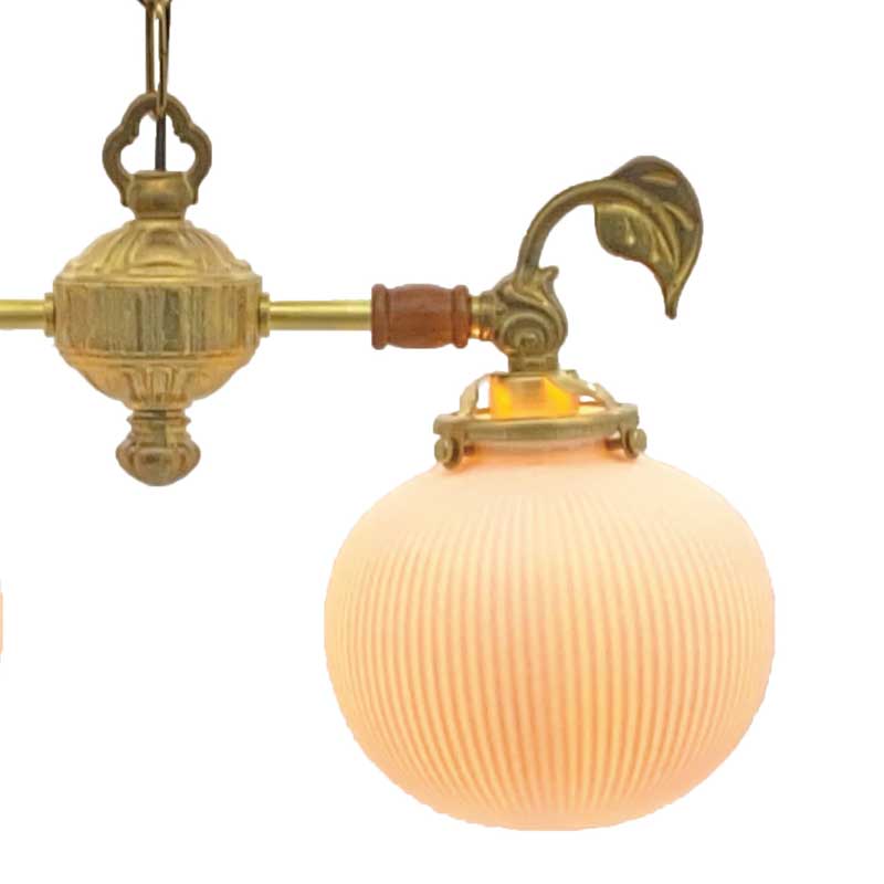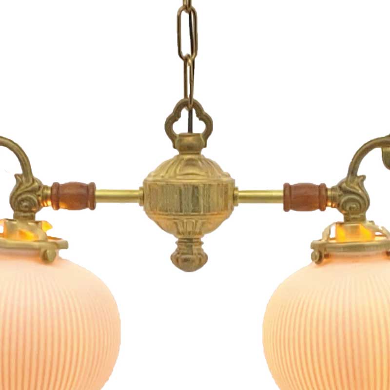フレームに葉っぱのモチーフの付いたおしゃれな2灯シャンデリア照明各パーツを海外にて生産し国内にて、組み立て配線しています。