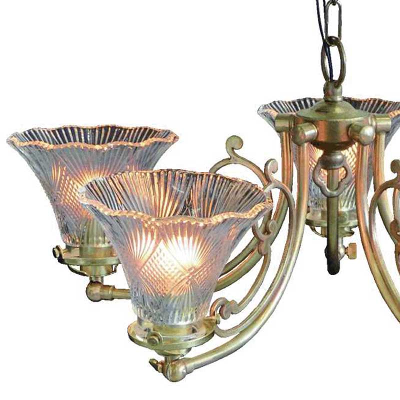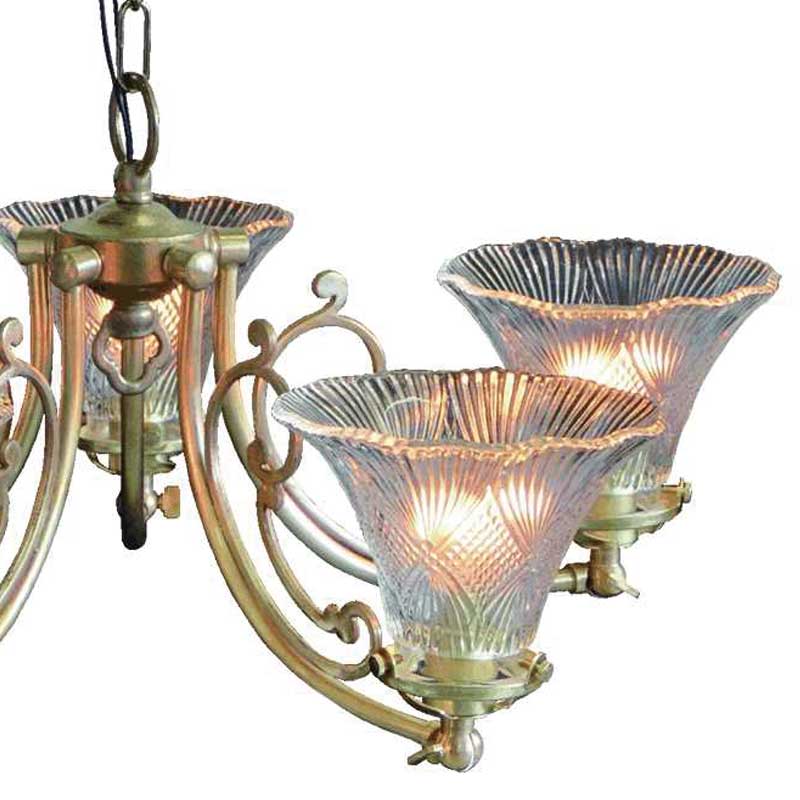 ゴールド色のフレームにカッティングされたおしゃれなシェードが付いた5灯シャンデリア照明各パーツを海外にて生産し国内にて、組み立て配線しています。