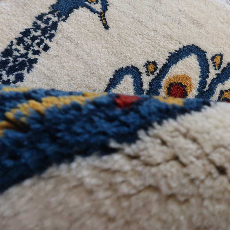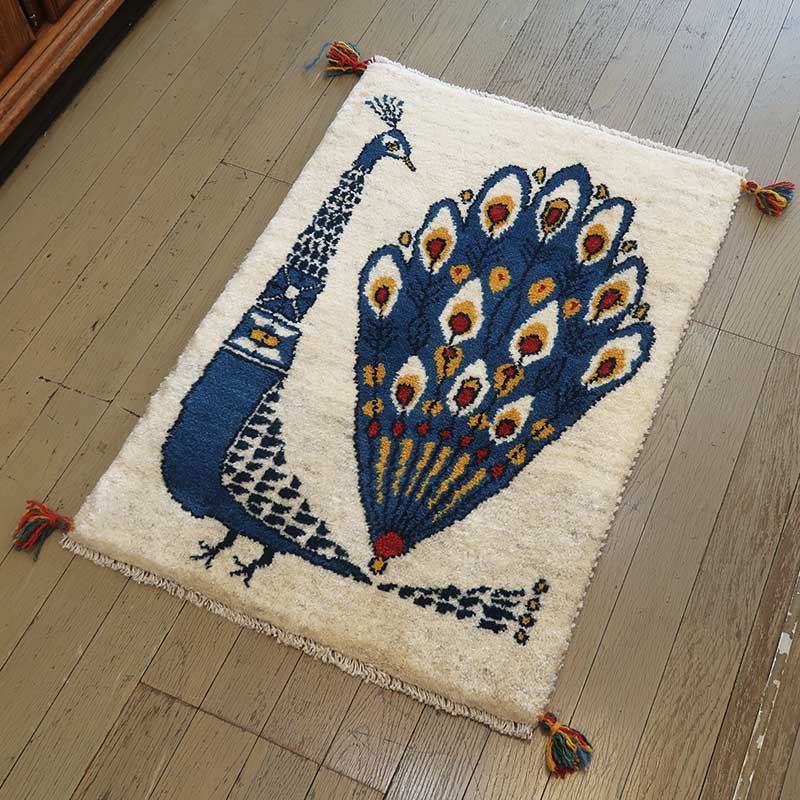 手織りの絨毯の中でも毛足が長いギャッベM-RJ13076。クジャクの絵柄が素敵。