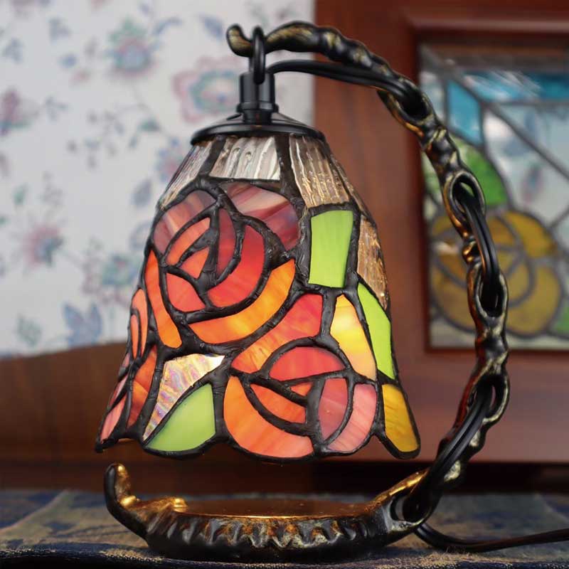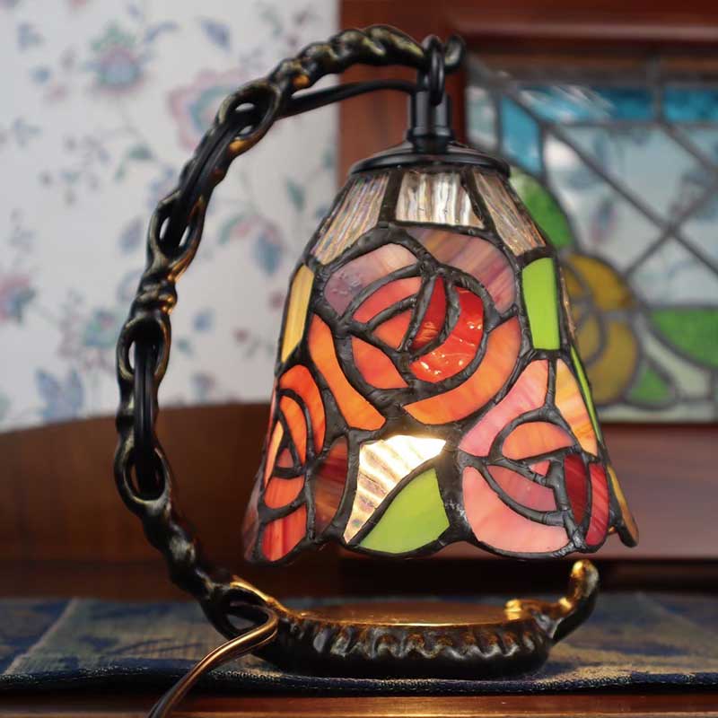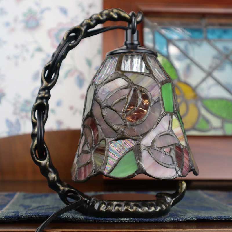 薔薇をモチーフにしたステンドグラスのシェードを吊り下げ型のベースに取り付けた手のひらにも乗るくらいのかわいらしいのステンドグラスランプです。
