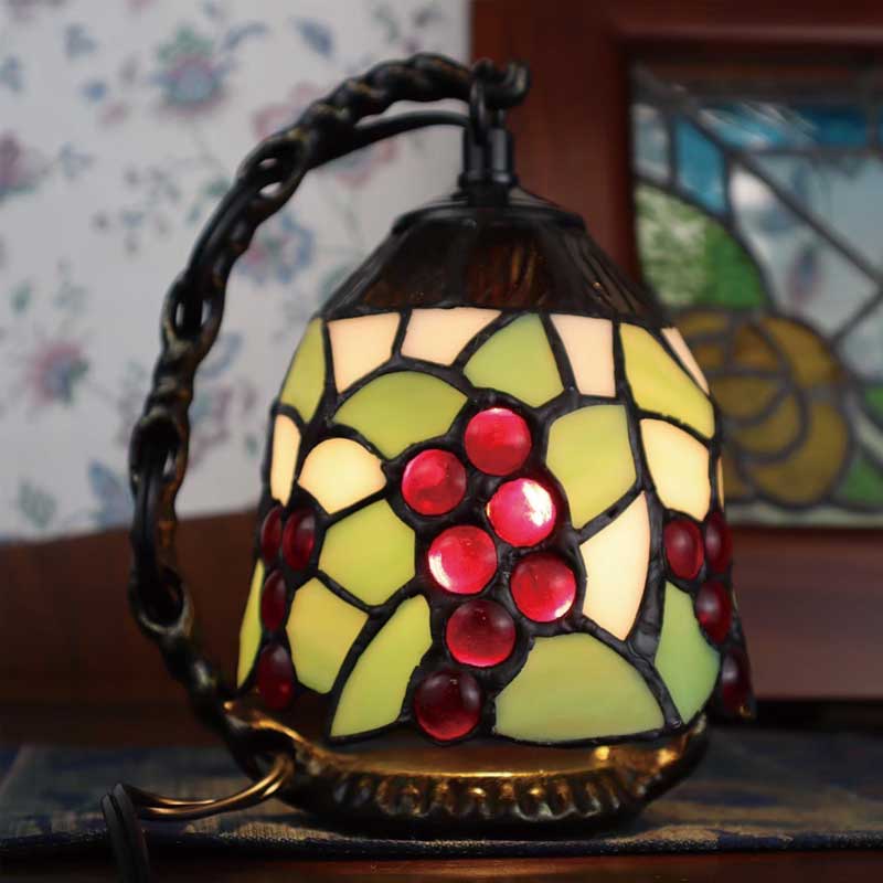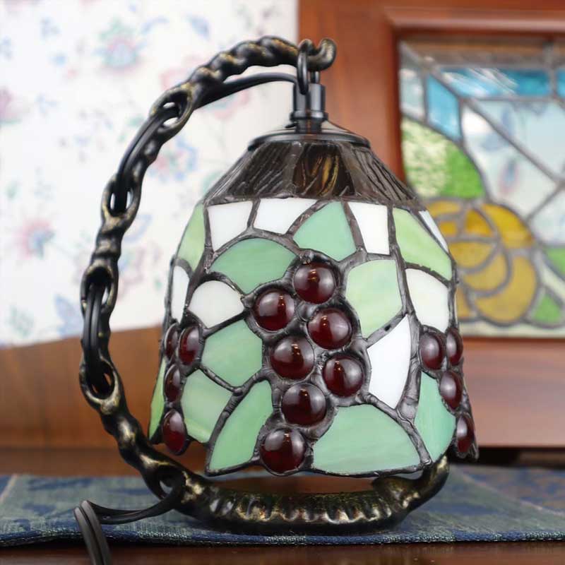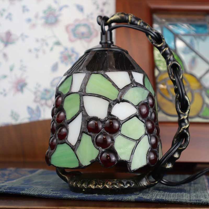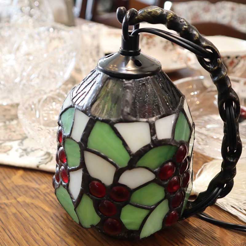 ブドウをモチーフにしたステンドグラスのシェードを吊り下げ型のベースに取り付けた手のひらにも乗るくらいのミニサイズのステンドグラスランプです。ガラスは、色ガラスと玉ガラスを使い、美しい光の癒しを演出します。