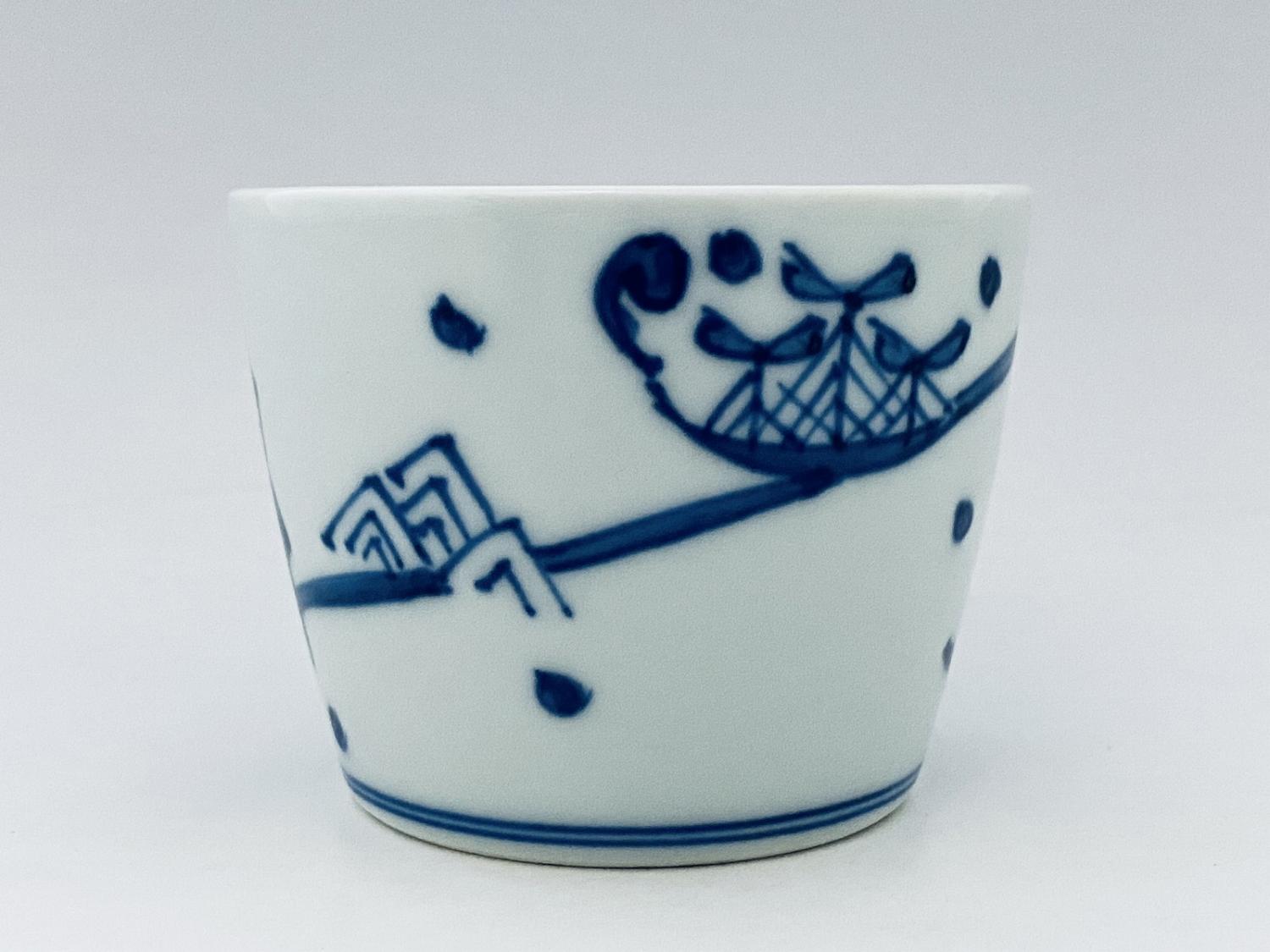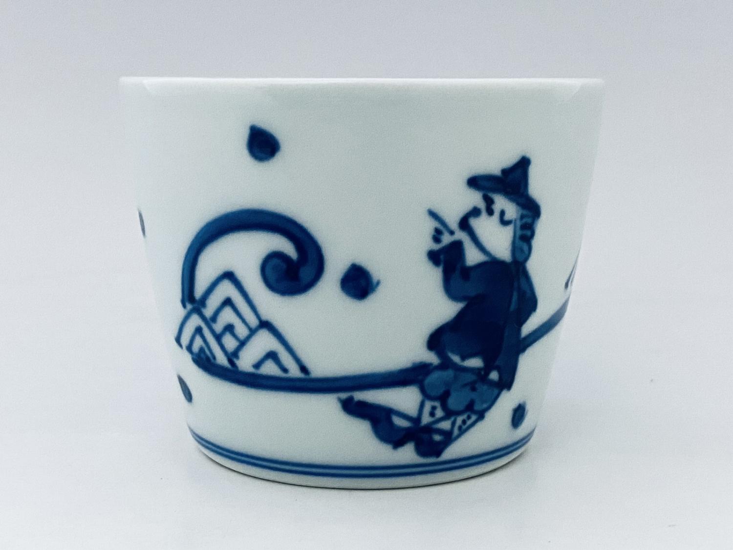 煎茶碗としても、珍味入れとしても、ご愛用頂ける愛らしいそば猪口に、意匠を凝らした波の文様に、愛らしい異人さん達を遊ばしてみました。
