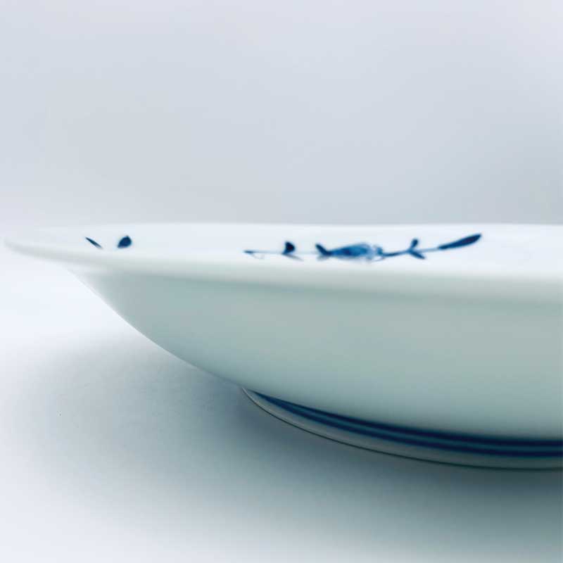 絵柄は、勢いある筆致で描かれた草花紋と三人の異人さんを施した楕円皿で、カレーをはじめパスタや煮物など、和食にも使える青花で人気の器です