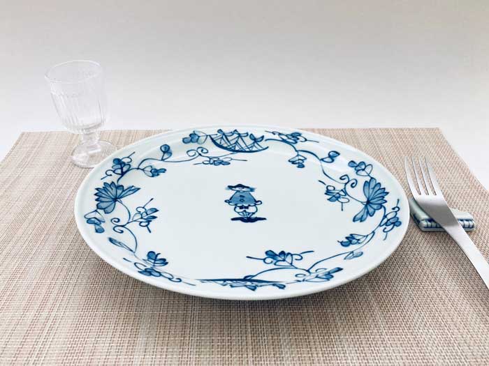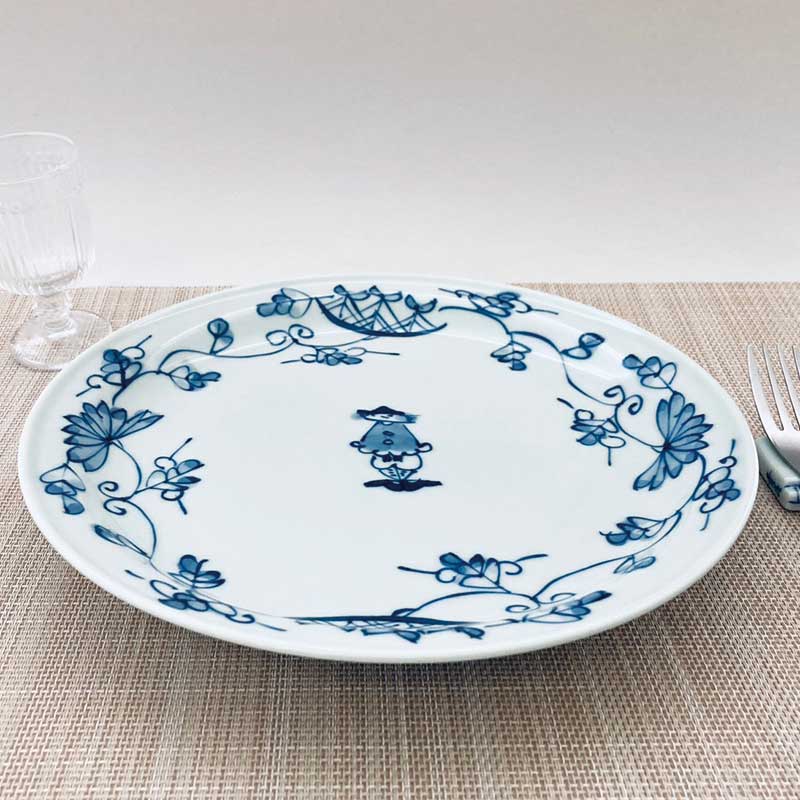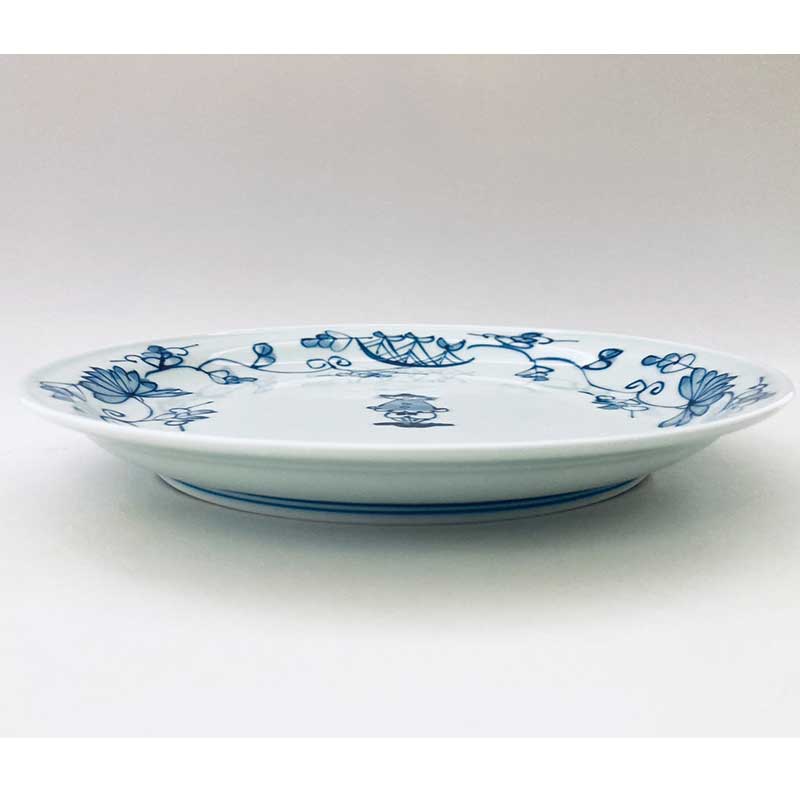 船と異人さんに伝統柄である唐草が淡い色調で丁寧に描かれています。料理の盛り映えもよく、青花ブランドのなかで、とても人気がある絵柄です。