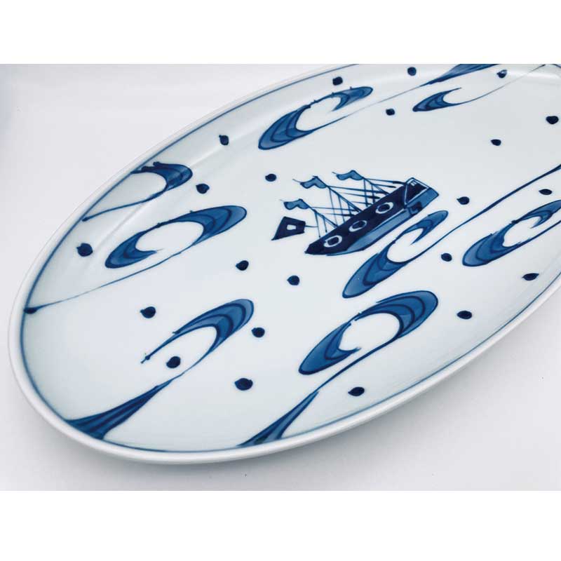 楕円形の大きいお皿に大海原に向かう帆船のイメージを致しました。新鮮なサラダの盛り合わせも映えますし、パスタやカレーにもオススメです。