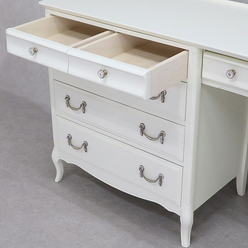 ミラーナWシリーズは、上品さとナチュラルさを併せ持ち、緩やかな曲線を巧みに活かした引き出しの前面と宮廷装飾を思わせるシャビ―塗装を施した大き目の把手が印象的な家具シリーズです。