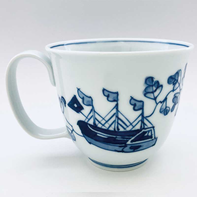 取っ手を工夫をしてとても持ちやすいマグカップです。「唐草異人」の絵柄は、大変人気があります。