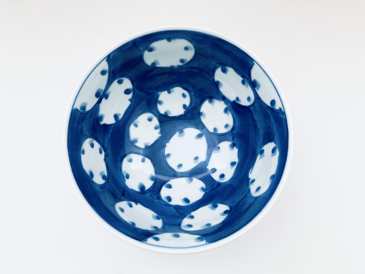 内外に描かれた丸紋の背景を豪快に呉須で塗りました。