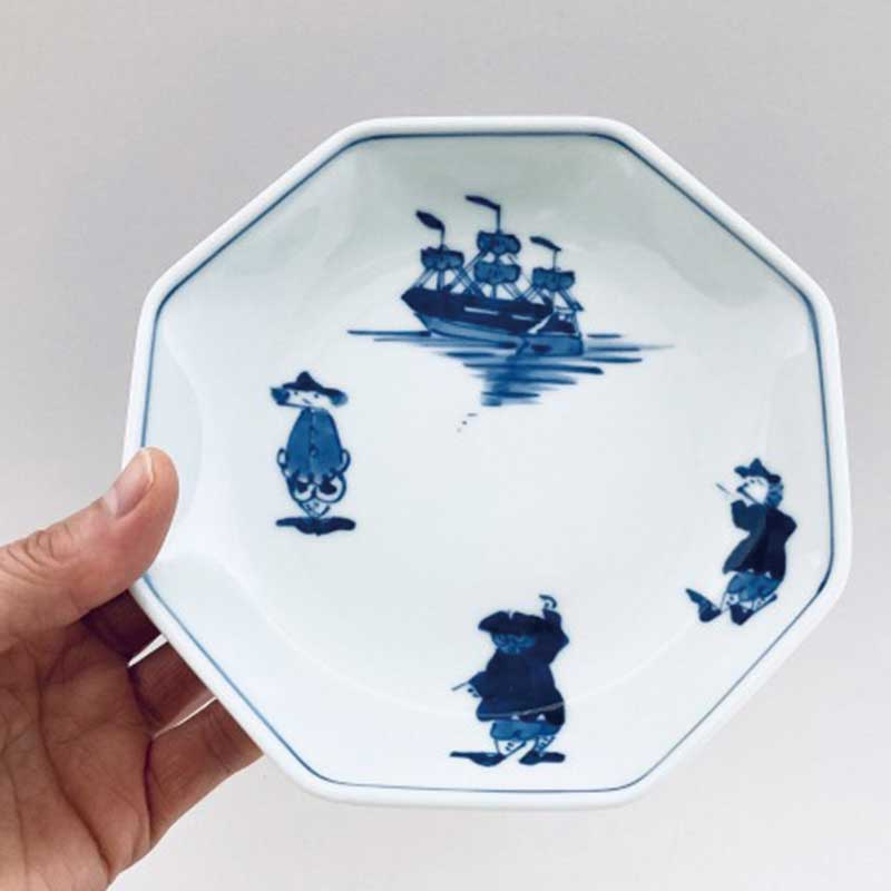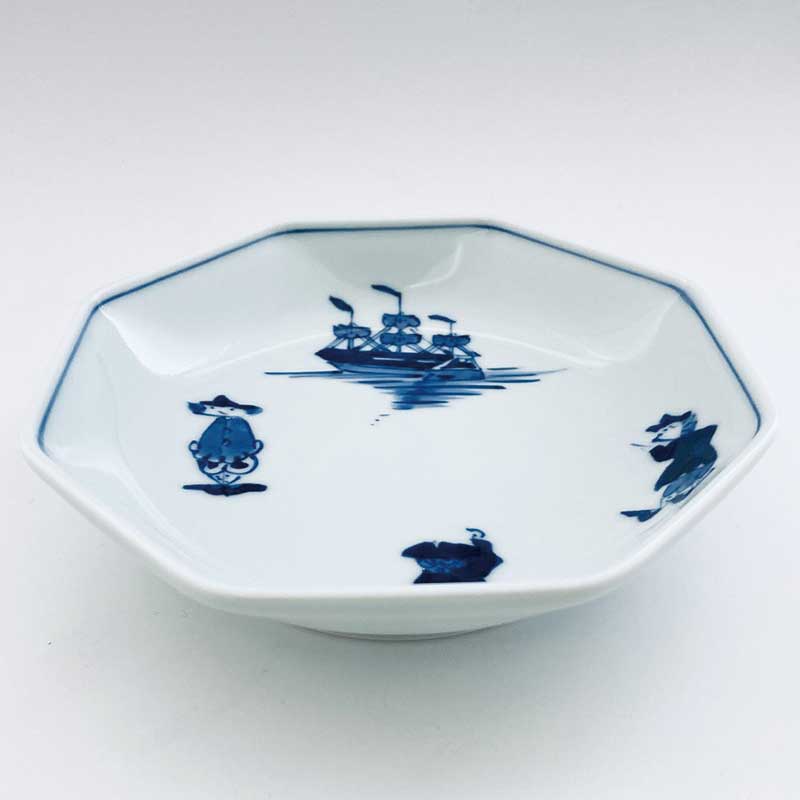 三人異人と帆船 正八角5寸皿 青花 有田焼