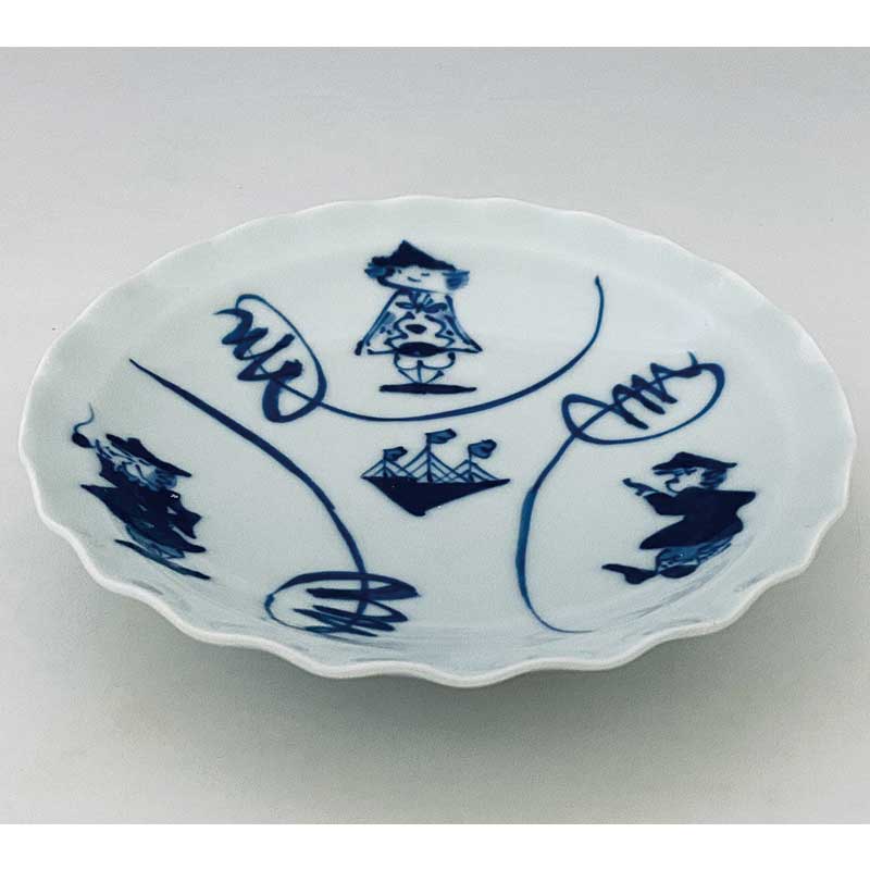 取皿としてもお使いいただける、渕のフリルがお洒落な輪花皿に、愛らしい異人さんが三人揃った間取異人を配してみました。
