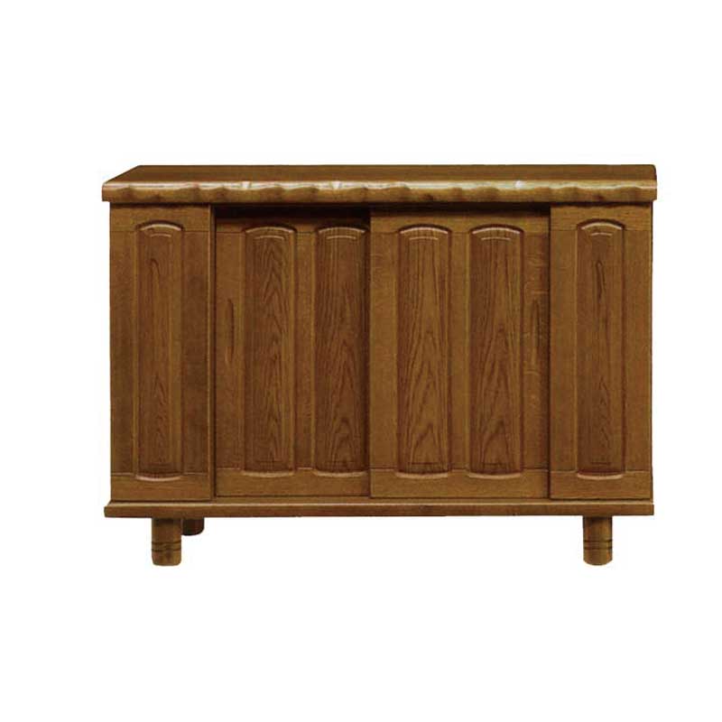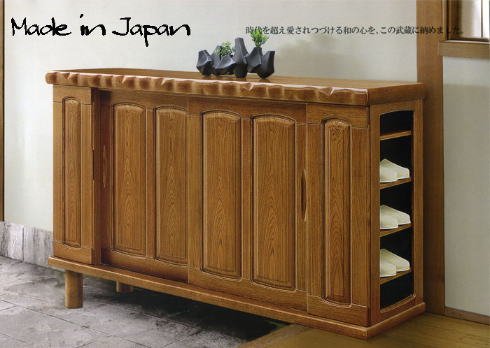天板は、60mmの厚さの耳付きの一枚板風仕上げで豪華な風合い。150cm幅ロータイプの和風の下駄箱(シューズボックス)武蔵は、ロングセラーの人気商品です。