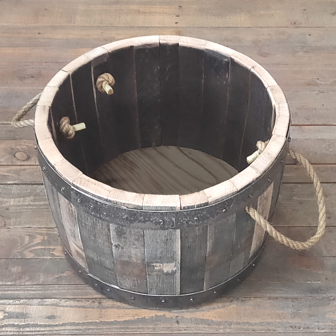 樽好きにはたまらない風合いをそのままのに残し、磨き上げサイズに合わせ熟練の職人が作り上げたウイスキー樽材使用のワイドバケット持ち手付きです。