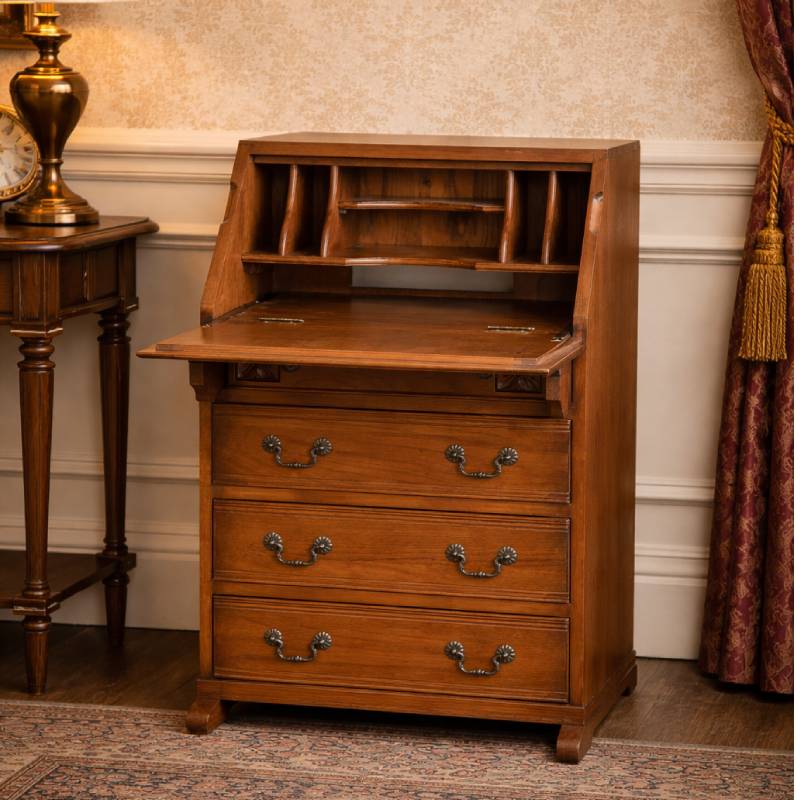 英国伝統ビクトリアン様式のアンティーク風のコンパクトサイズのライティングデスクです。扉の中の収納量も中々です。