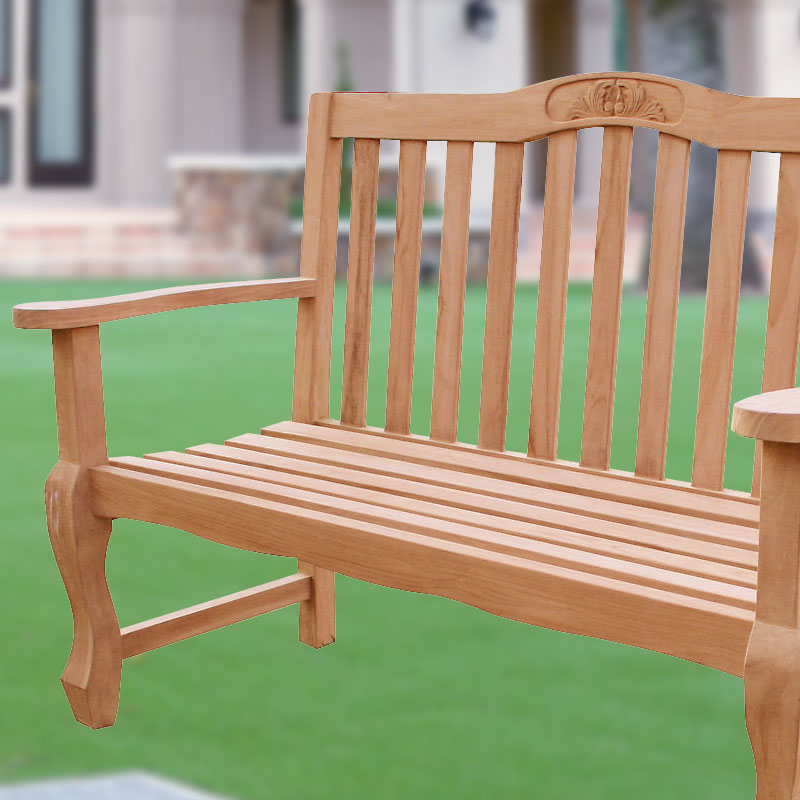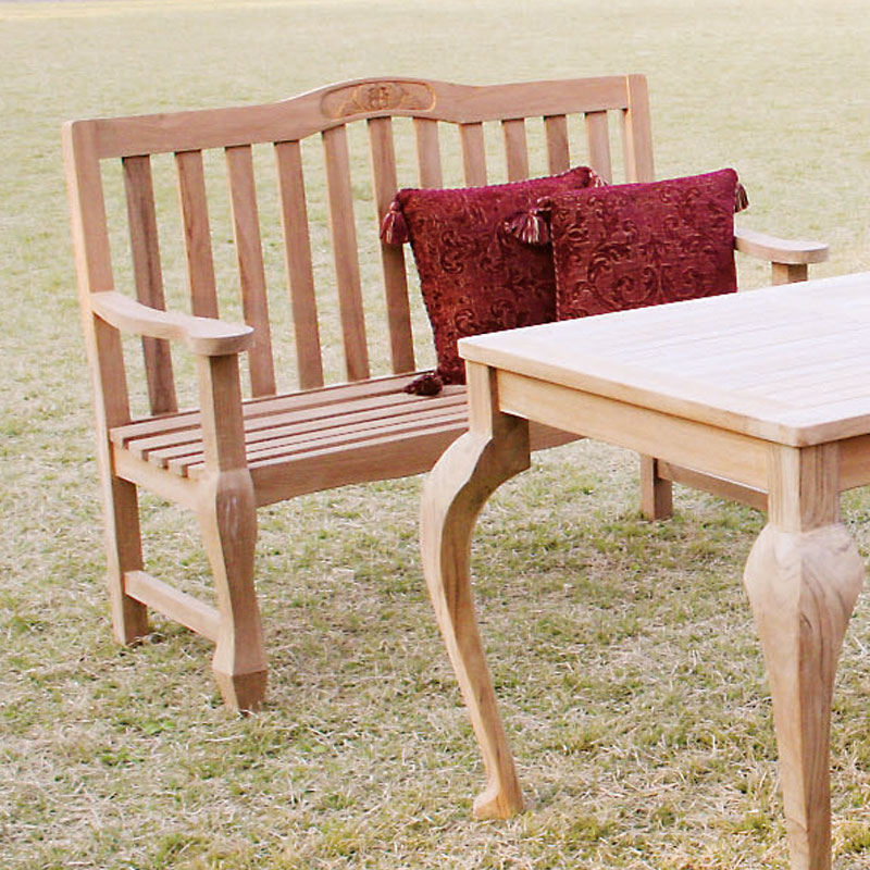 手作りベンチは、彫刻入りでかわいらしいけど、木部は、チーク材が重厚で丈夫なガーデンファニチャー(家具)のベンチです。