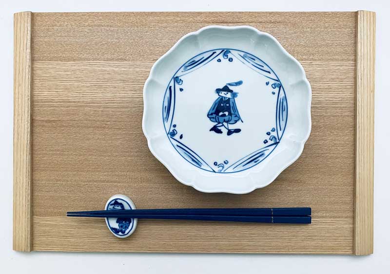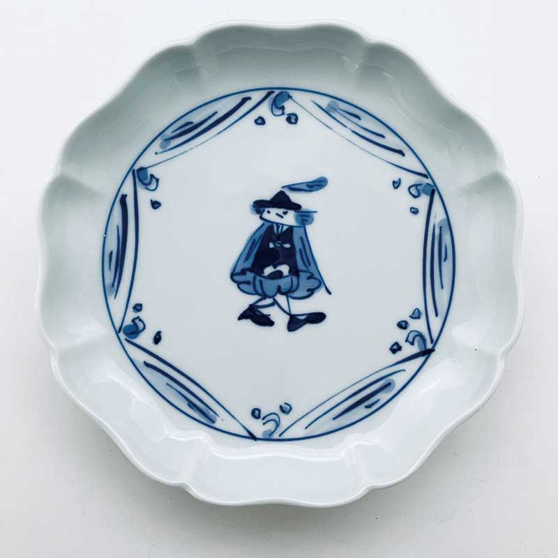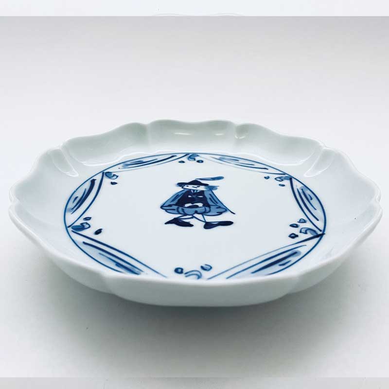 お洒落な八方割加工を施した、銘々皿としてもお使いいただける5寸皿に、波間に佇む異人さんを描いてみました。