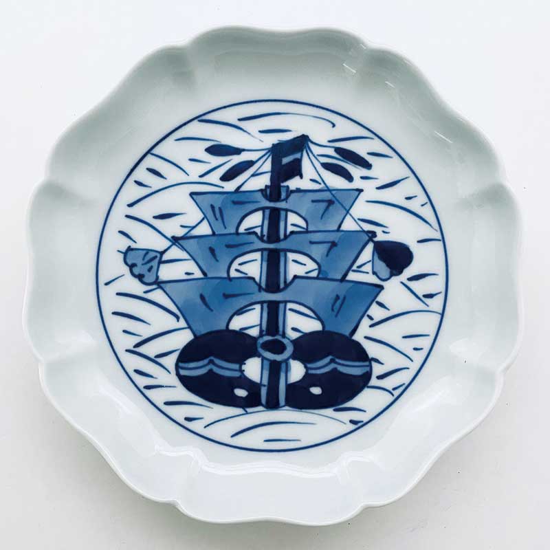お洒落な八方割加工を施した、銘々皿としてもお使いいただける5寸皿に、大海に浮かぶ帆船を描いてみました。