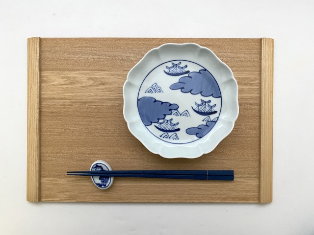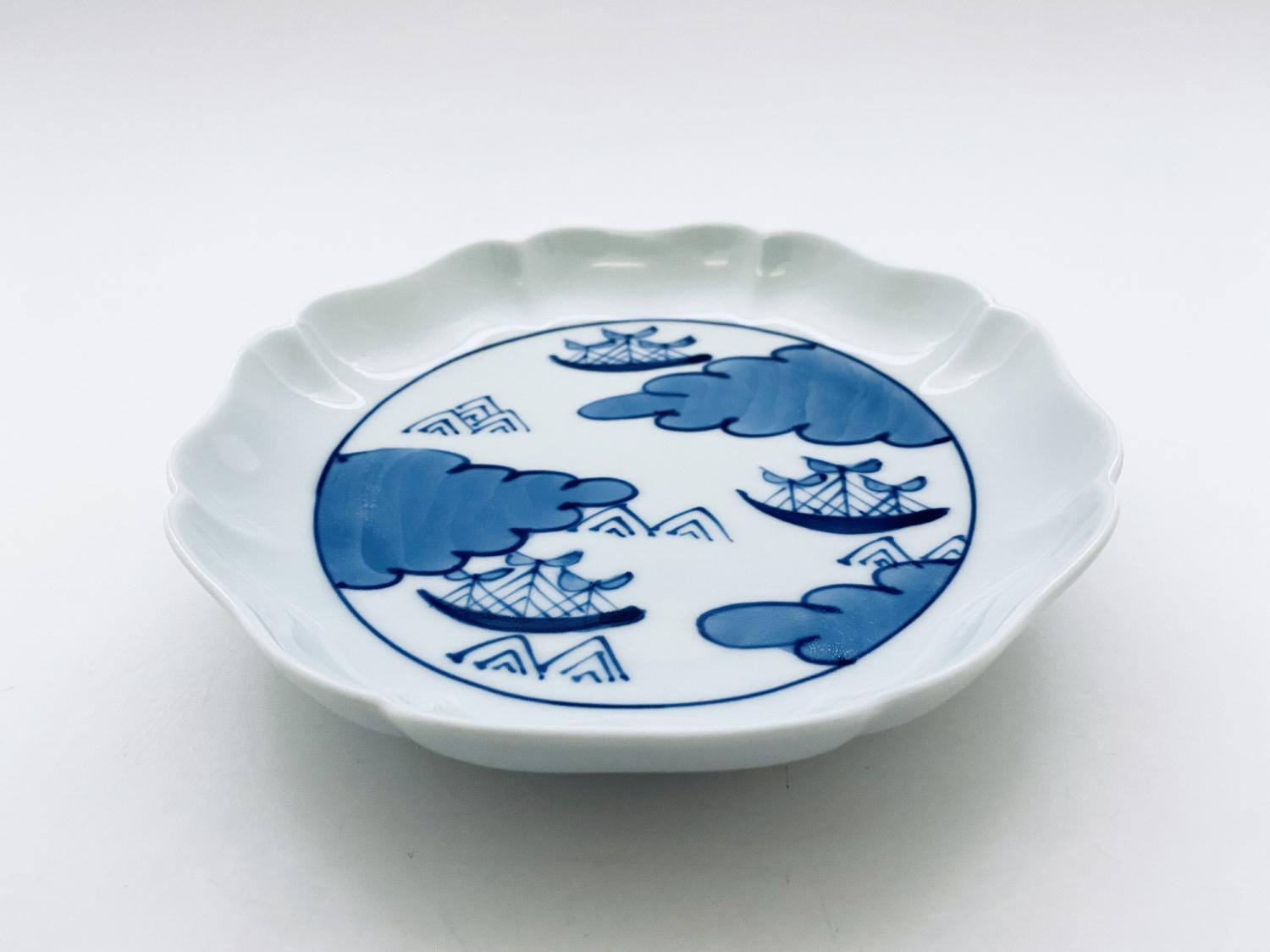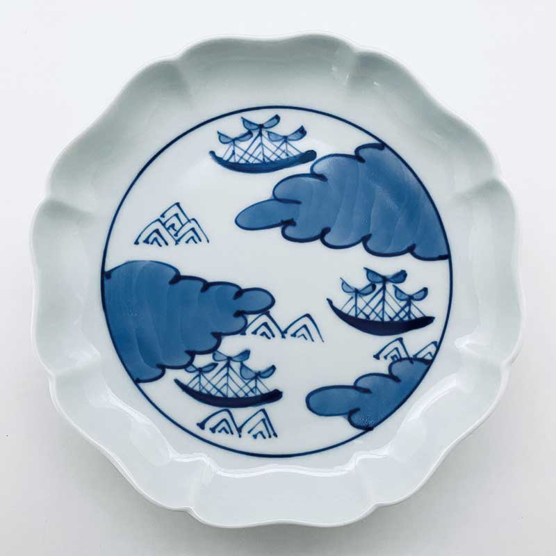お洒落な八方割加工を施した、銘々皿としてもお使いいただける5寸皿に、雲間に浮かぶ帆船を浮かべてみました。