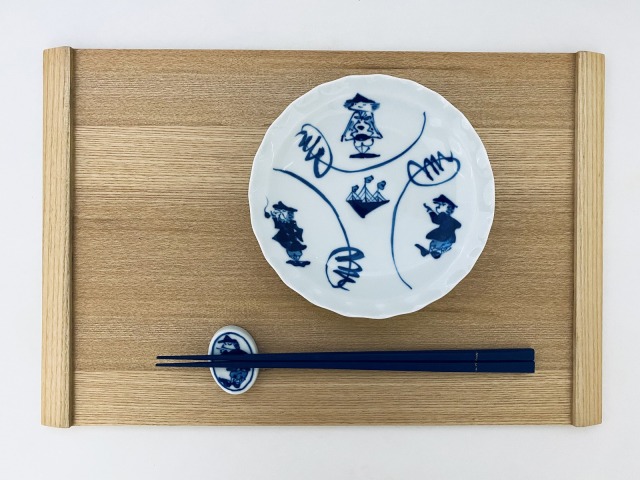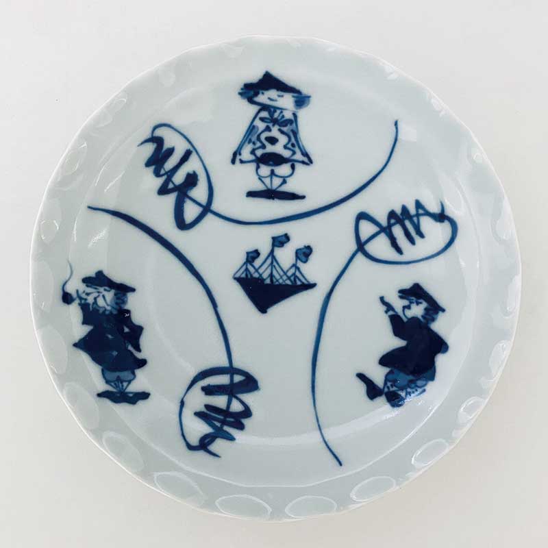 取皿としてもお使いいただける、渕のフリルがお洒落な輪花皿に、愛らしい異人さんが三人揃った間取異人を配してみました。