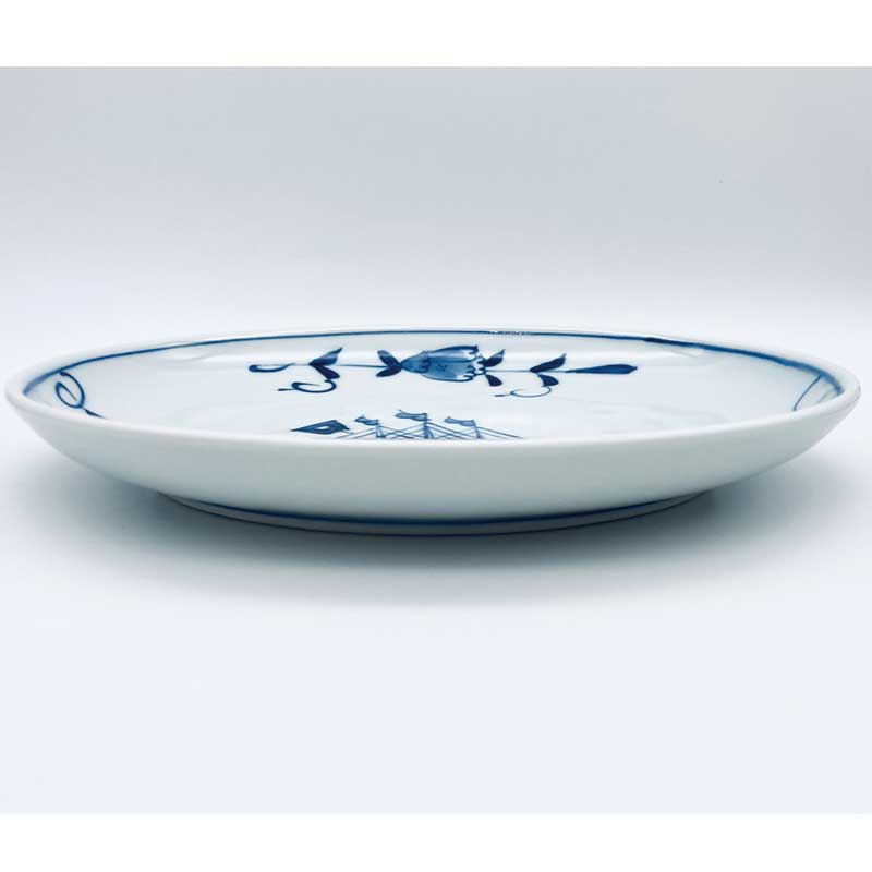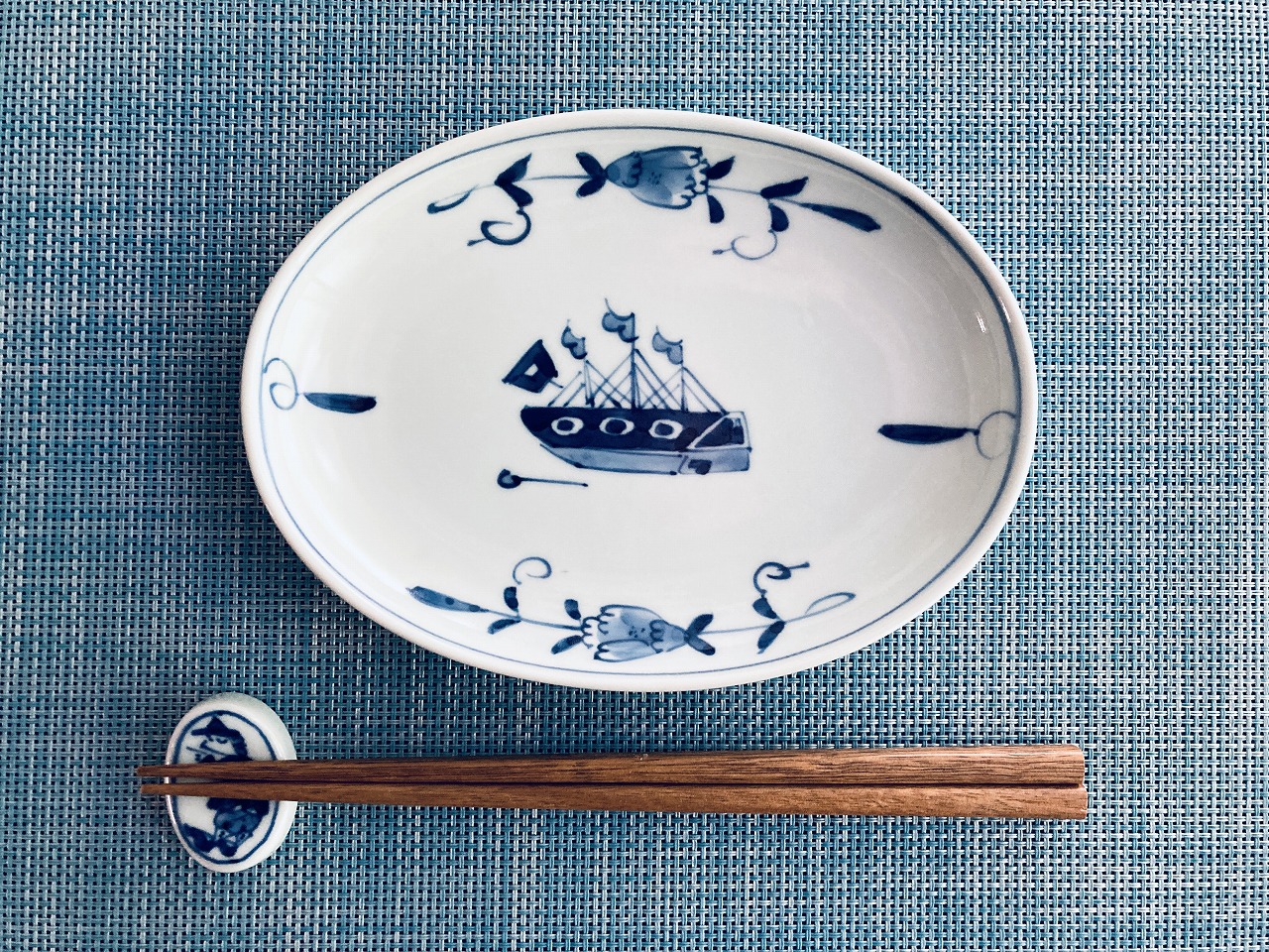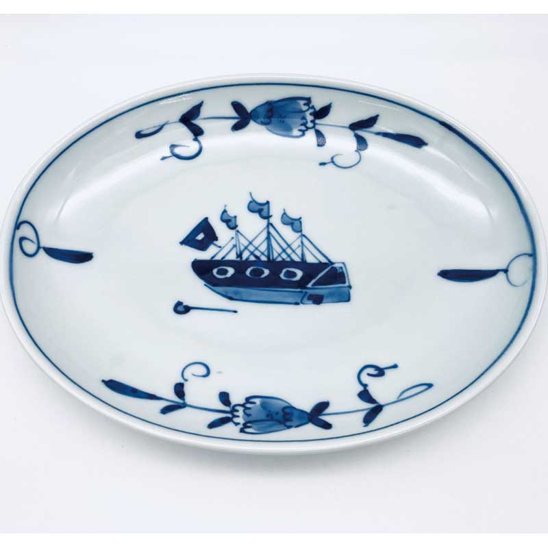 丈夫で扱いやすい楕円形のお皿に、大海原に就航する船を描きました。