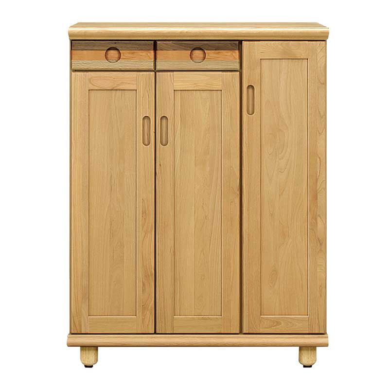 高位級無垢材、ブラックウォールナット、ブラックチェリー、オークの3種類にて製作された引き出し前板がアクセントになった、かわいらしいデザインが特徴の87cm幅ロータイプの下駄箱(シューズボックス・収納)です。